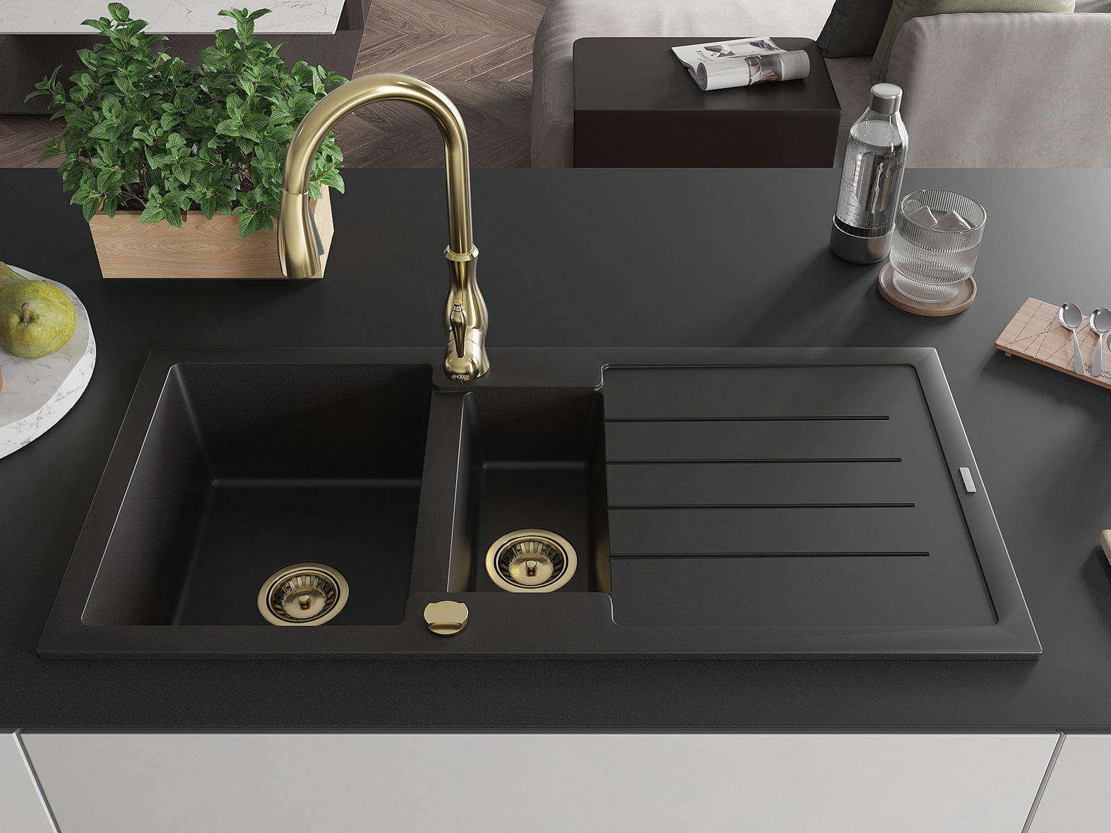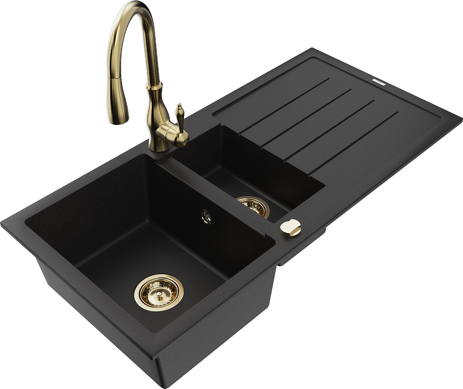 Mexen Andres granitový drez 1,5-komorový s odkvapkávacou plochou a kuchynskou batériou Savita, čierny - 6515-77-672601-50