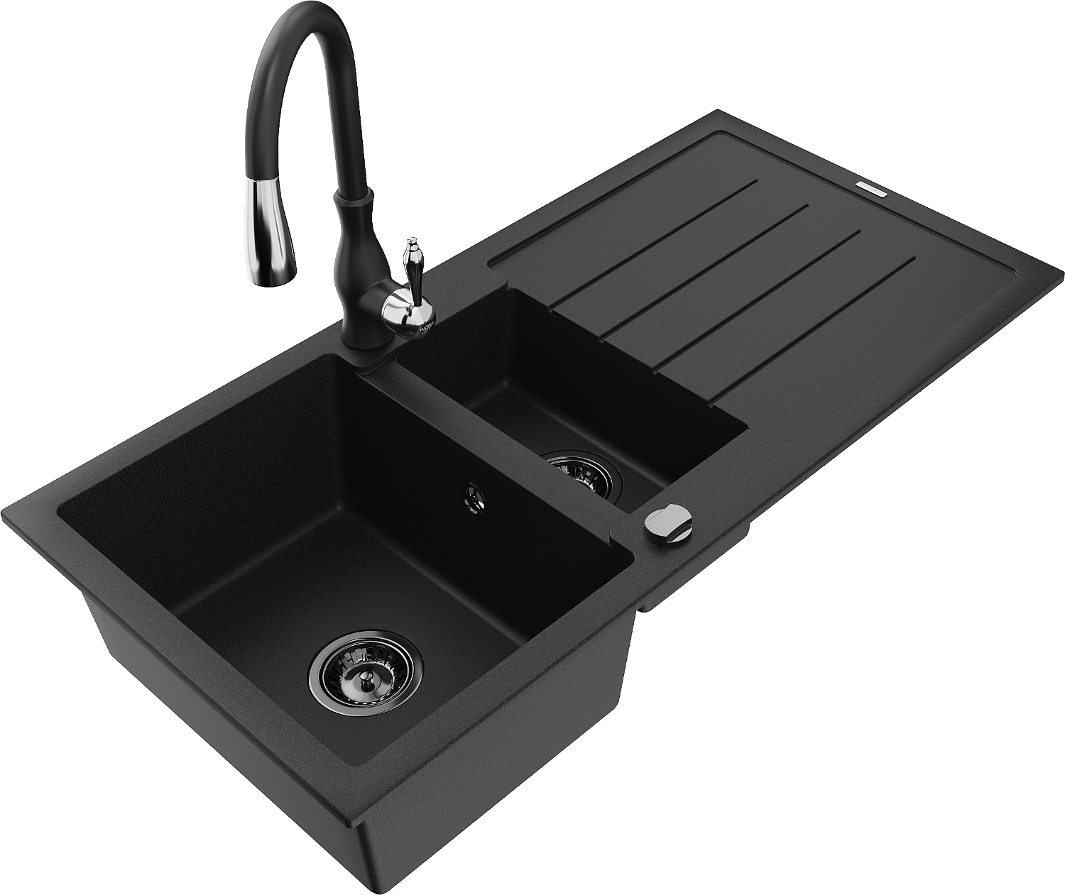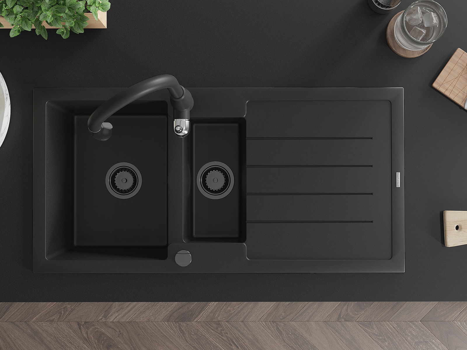 Mexen Andres žulový drez 1,5-komorový s odkvapkávačom a kuchynskou batériou Savita, čierny - 6515-77-672601-70-B
