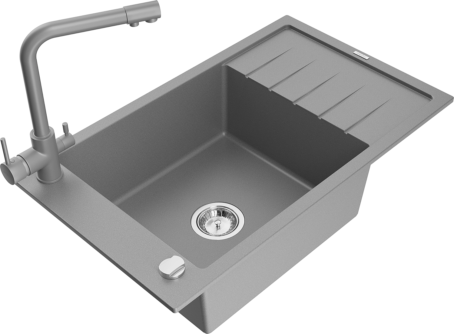 Mexen Elias granitový kuchynský drez s 1 komorou, odkvapkávacou plochou a kuchynská batéria Duero, sivá - 6511-71-671600-71