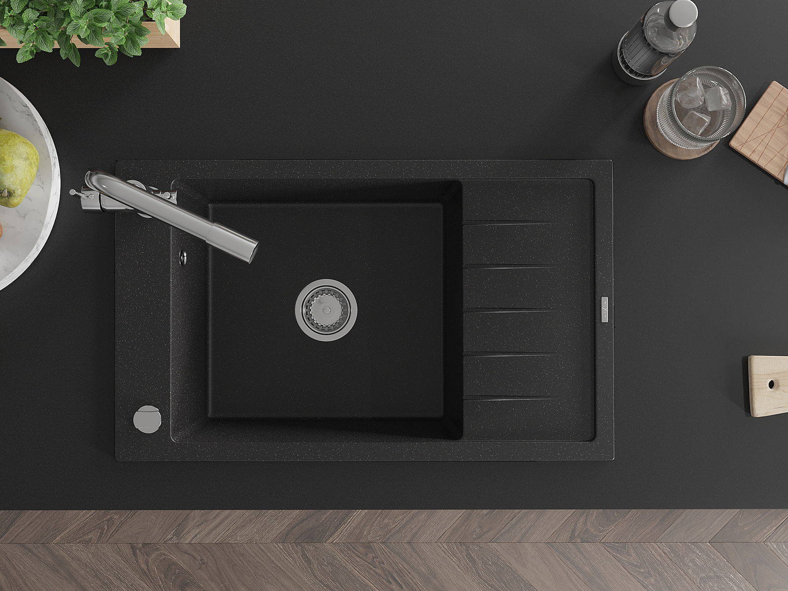 Mexen Elias granitový drez s 1 komorou s odkvapkávačom a kuchynskou batériou Duero, čierny/strieborný metalik