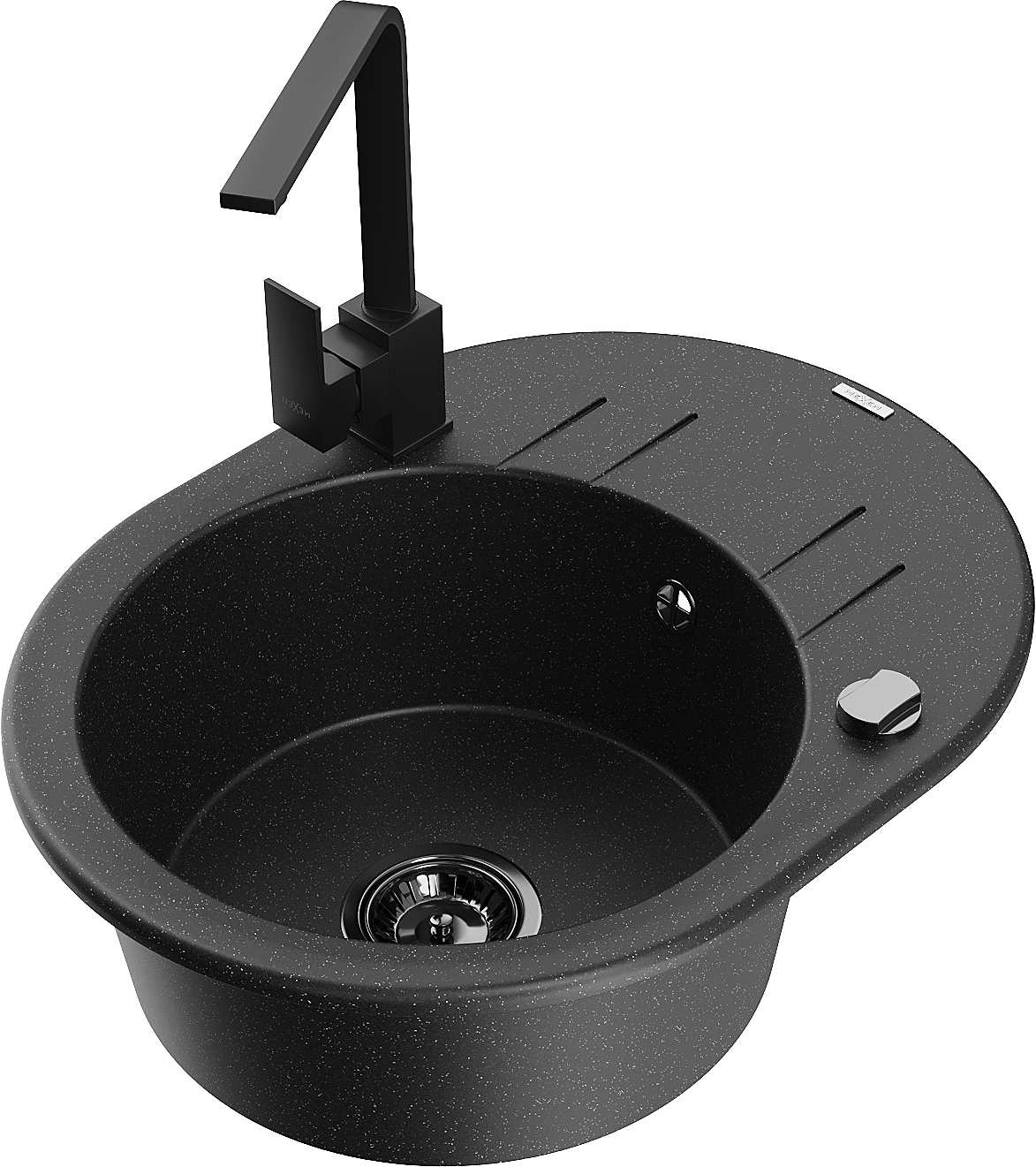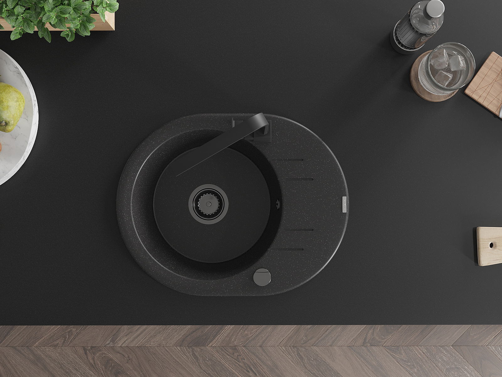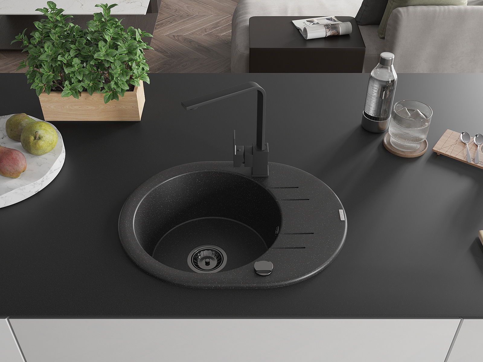 Mexen Kevin granitový kuchynský drez s 1 komorou, odkvapkávačom a kuchynskou batériou Rita, čierno/strieborný metalík