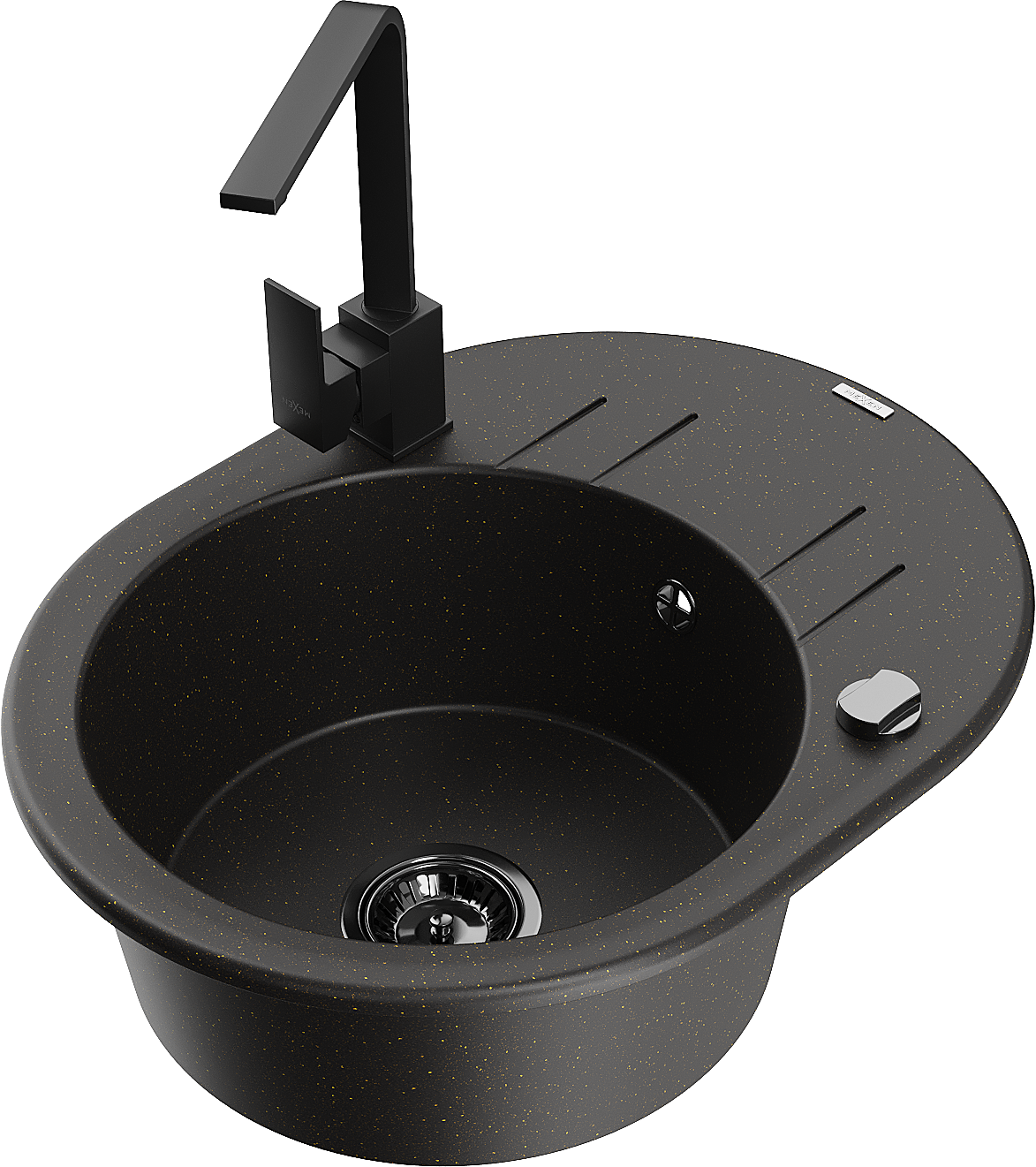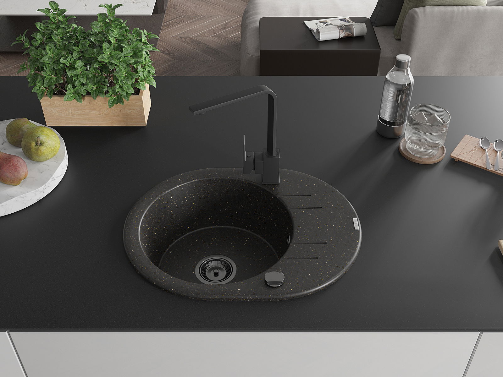 Mexen Kevin žulový drez 1-komorový s odkvapkávačom a kuchynskou batériou Rita, čierno/zlatý metalický - 6517-75-670300-70-B