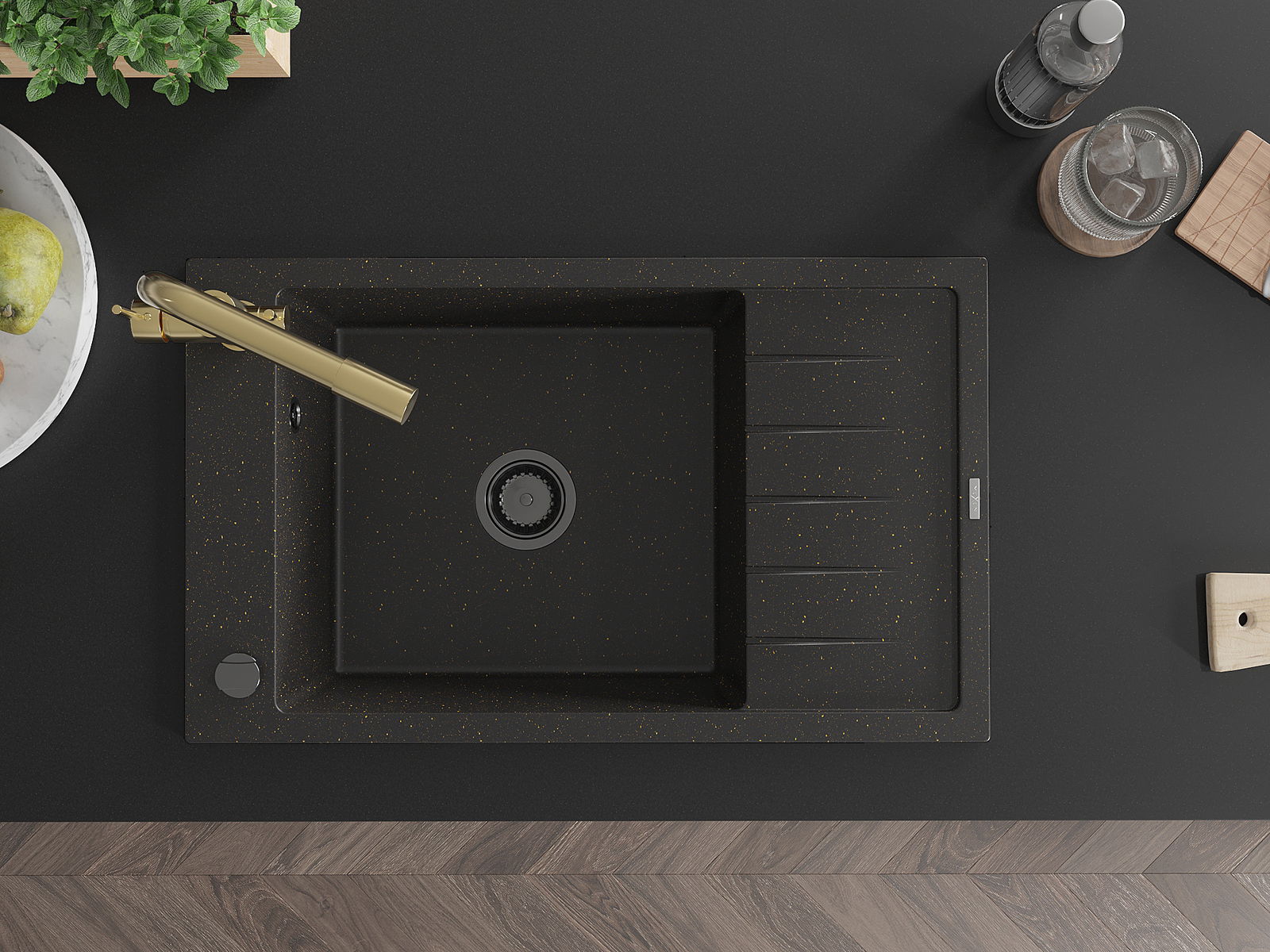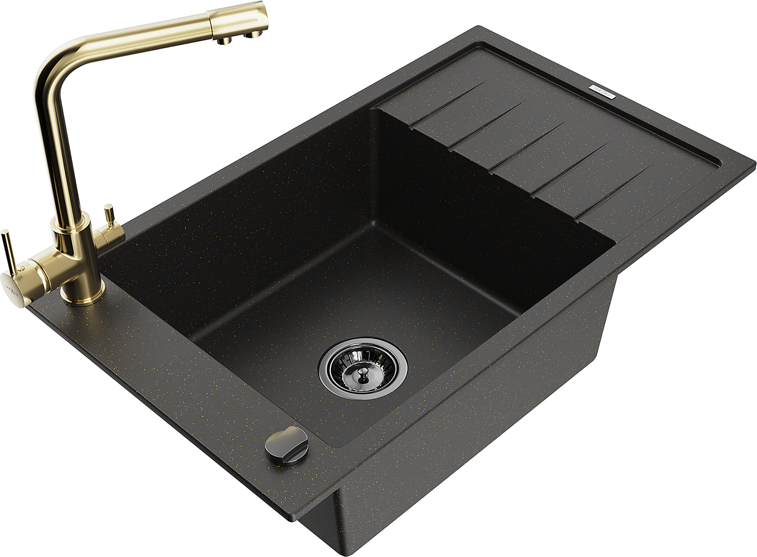 Mexen Elias granitový drez 1-komorový s odkvapkávačom a kuchynskou batériou Duero, čierny/zlatý metalik - 6511-75-671600-50-B