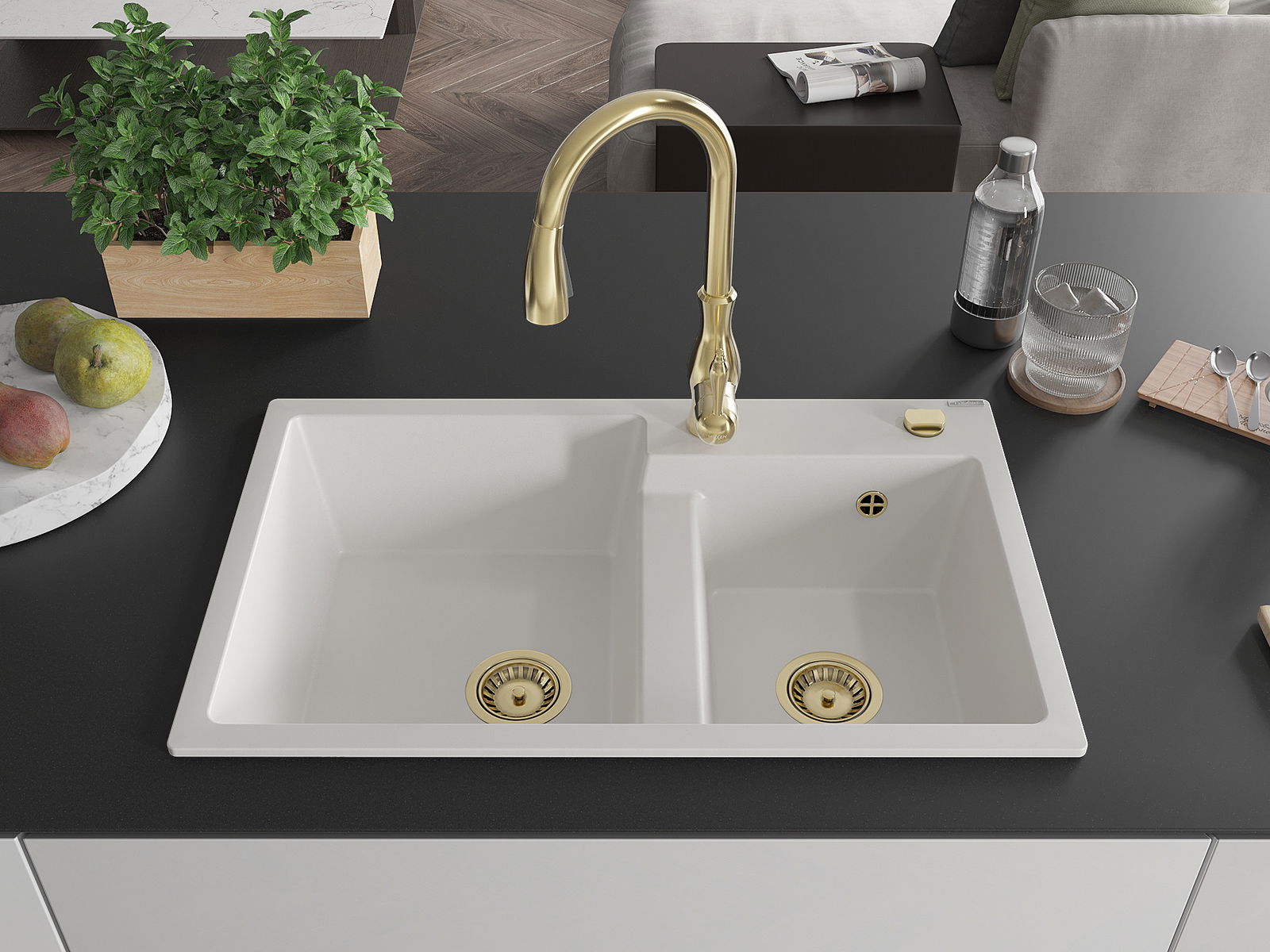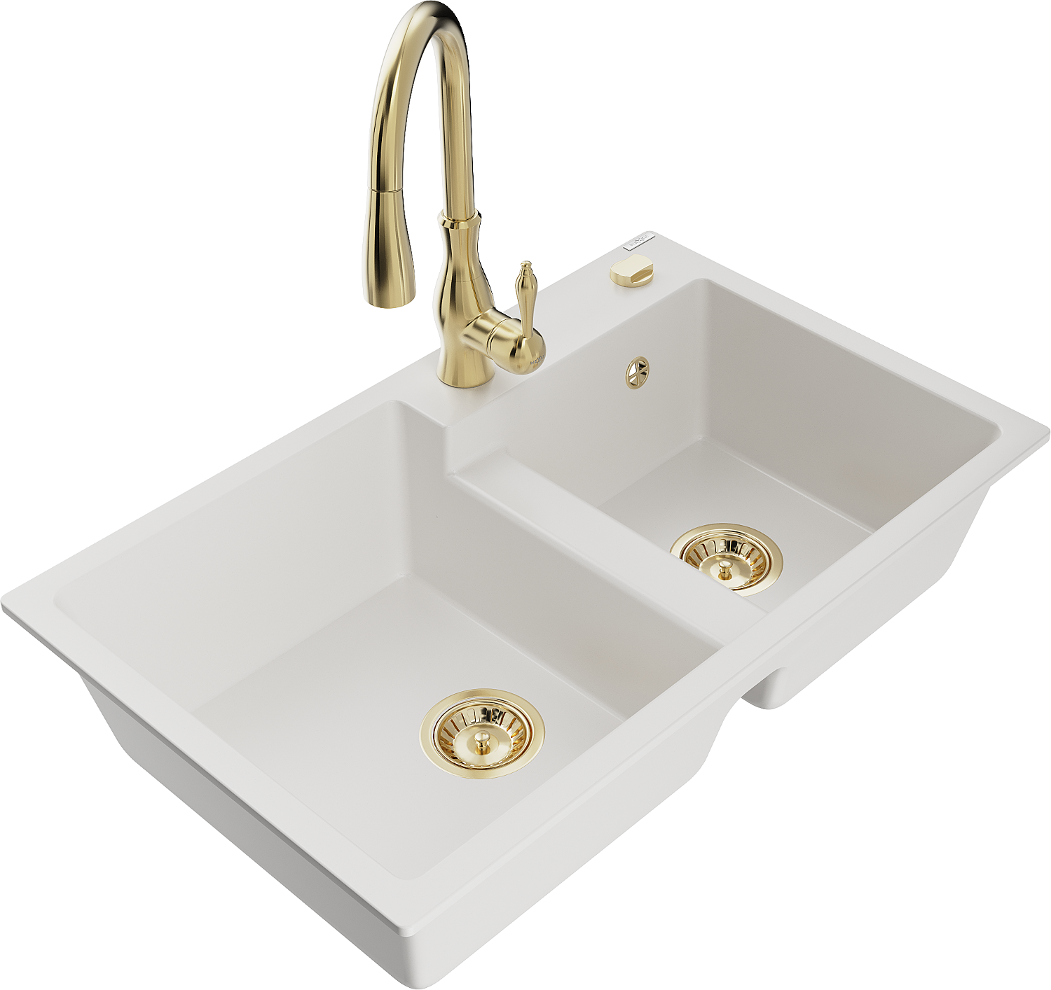 Mexen Tomas dvojkomorový žulový drez s kuchynskou batériou Savita, biely - 6516-20-672601-50