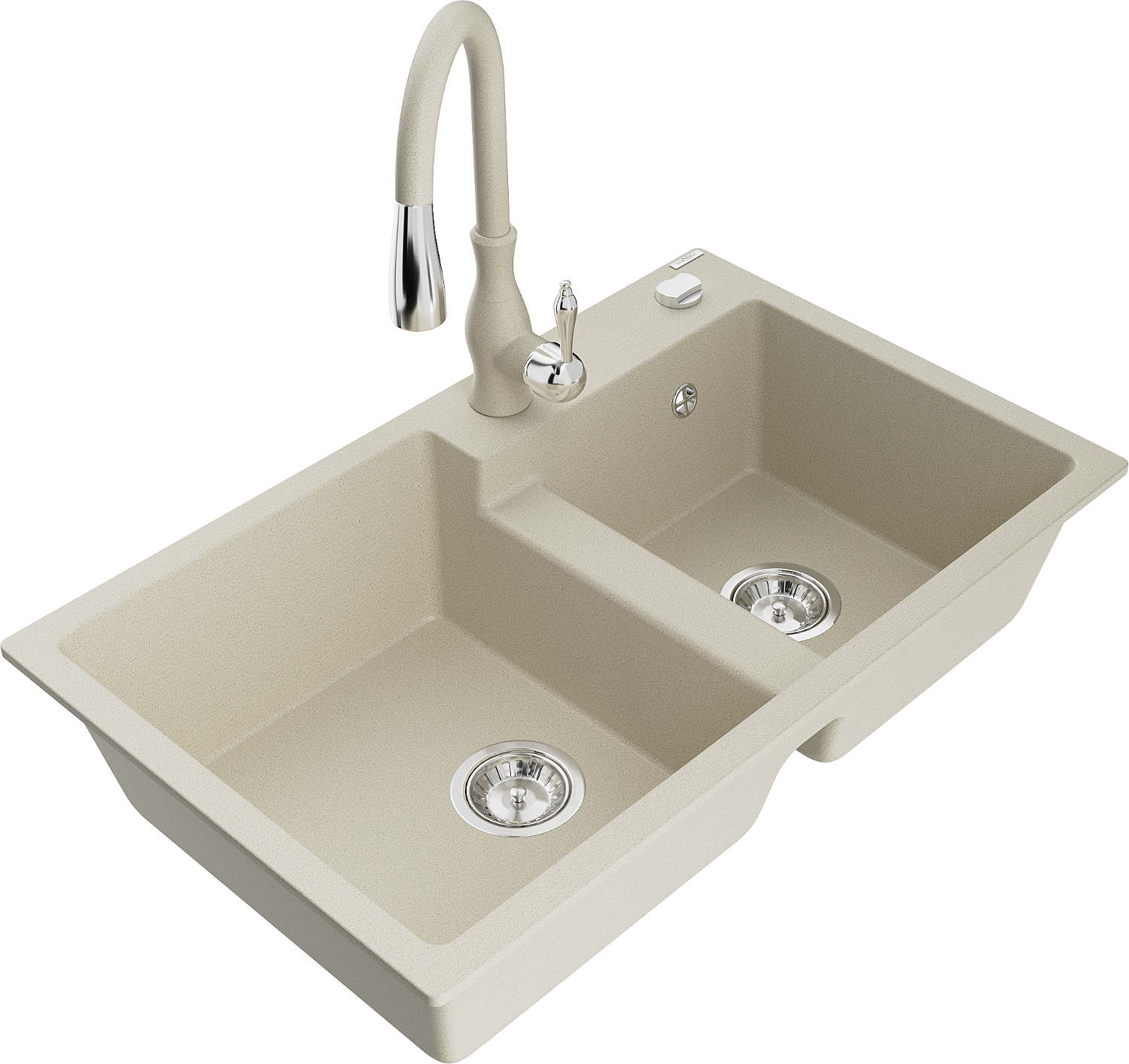Mexen Tomas granitový kuchynský drez 2-komorový s kuchynskou batériou Savita, béžový - 6516-69-672601-69