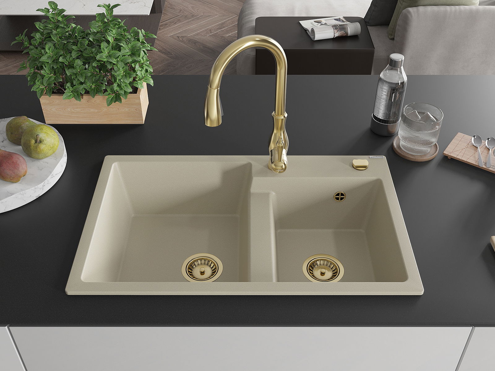 Mexen Tomas žulový dvojkomorový drez s kuchynskou batériou Savita, béžový - 6516-69-672601-50