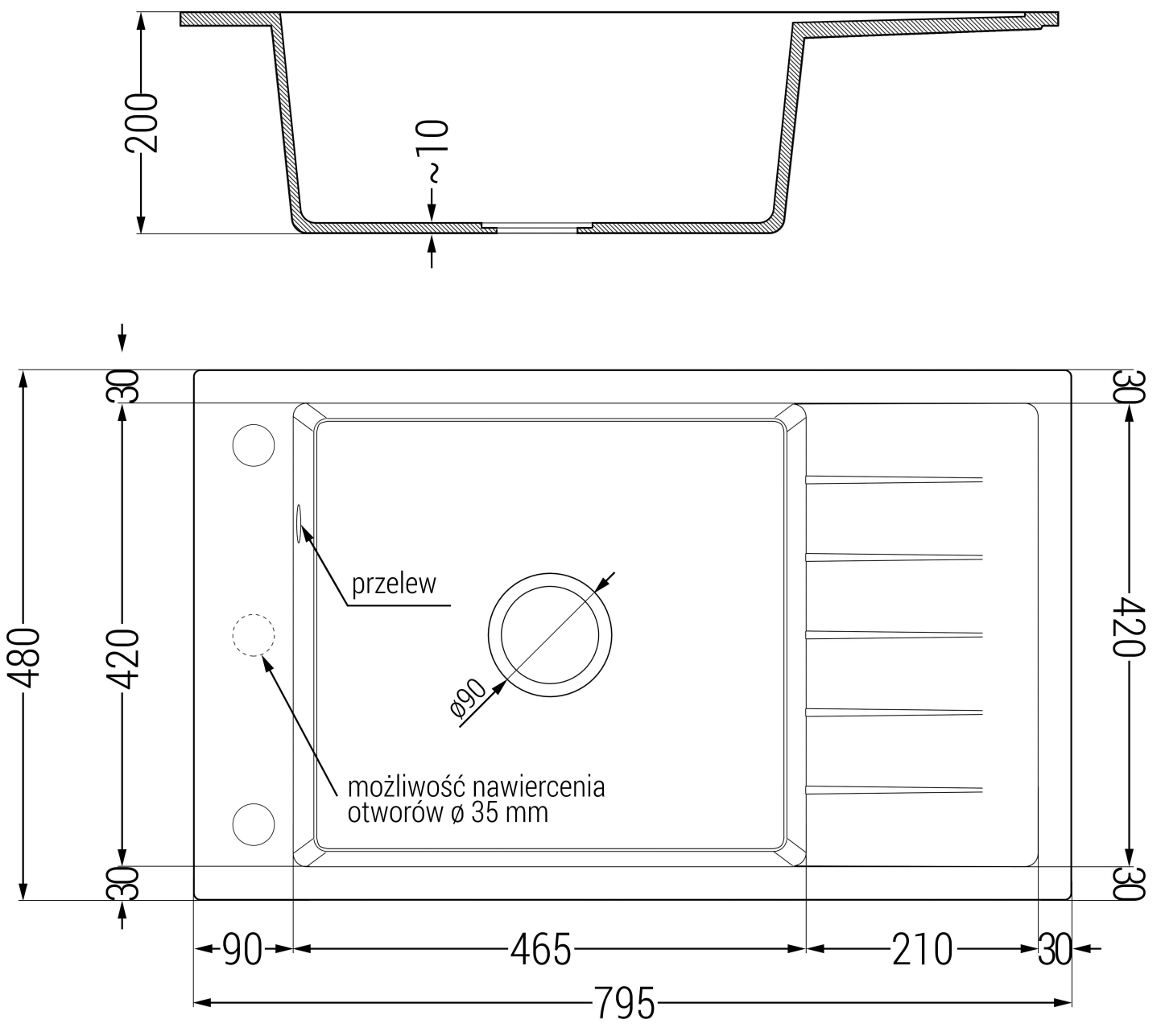 Drez má predfrézovaný otvor s priemerom 35 mm na samostatné prerazenie. Môže sa využiť napríklad na montáž dávkovača na tekutinu, ktorý eliminuje prítomnosť plastových fliaš v kuchyni a pridáva jej elegantné dokončenie.