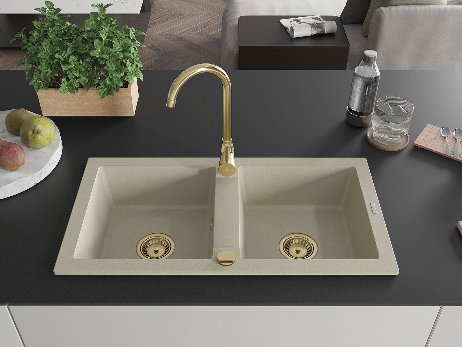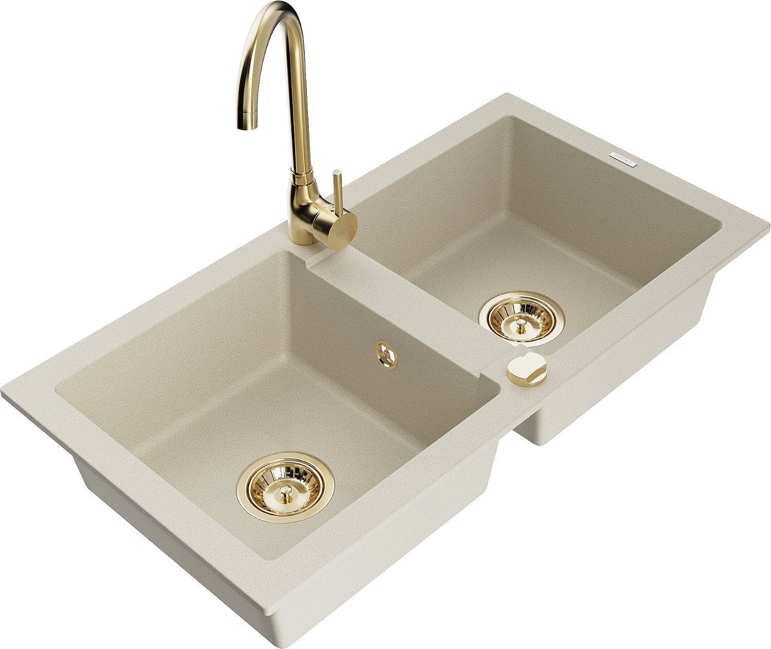 Mexen Mario žulový drez s 2 komorami a kuchynskou batériou Telma, béžový - 6504-69-670200-50