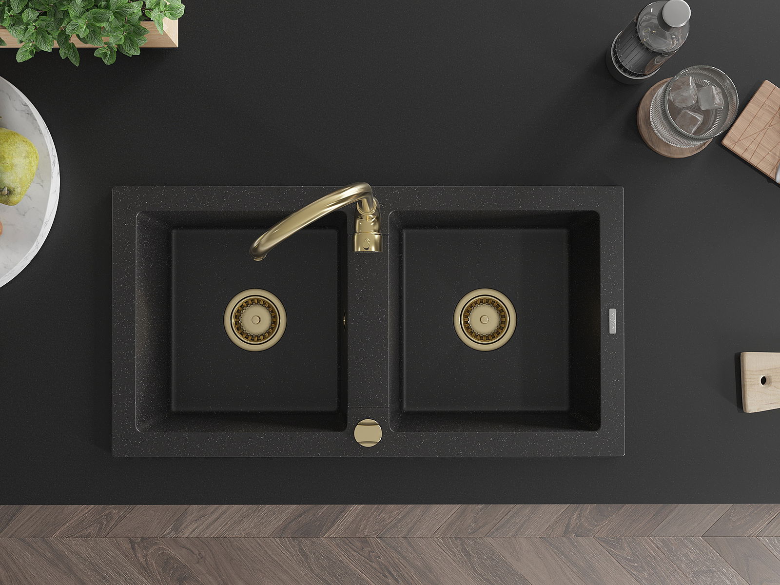 Mexen Mario granitový kuchynský drez 2-komorový s kuchynskou batériou Telma, čierny/strieborný - 6504-73-670200-50
