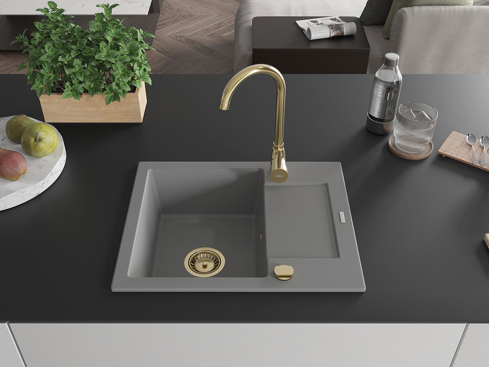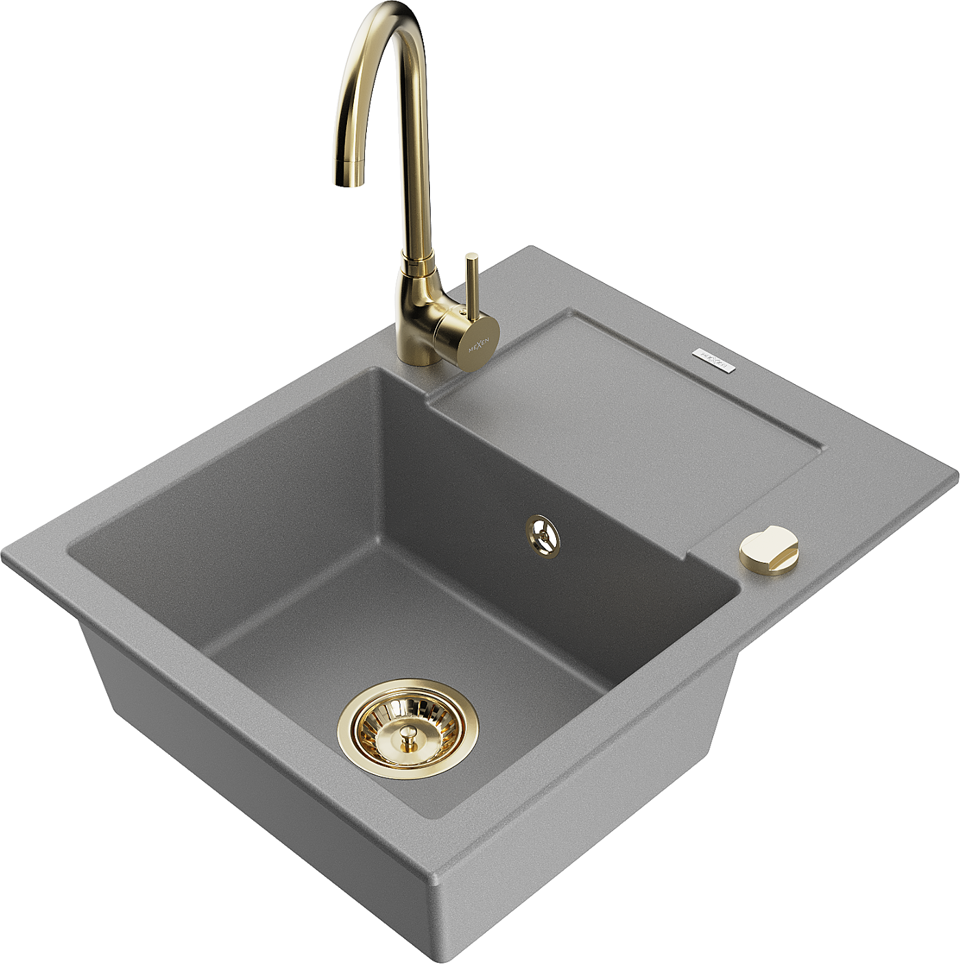 Mexen Enzo žulový kuchynský drez s 1 komorou, odkvapkávačom a kuchynskou batériou Telma, sivý - 6506-71-670200-50