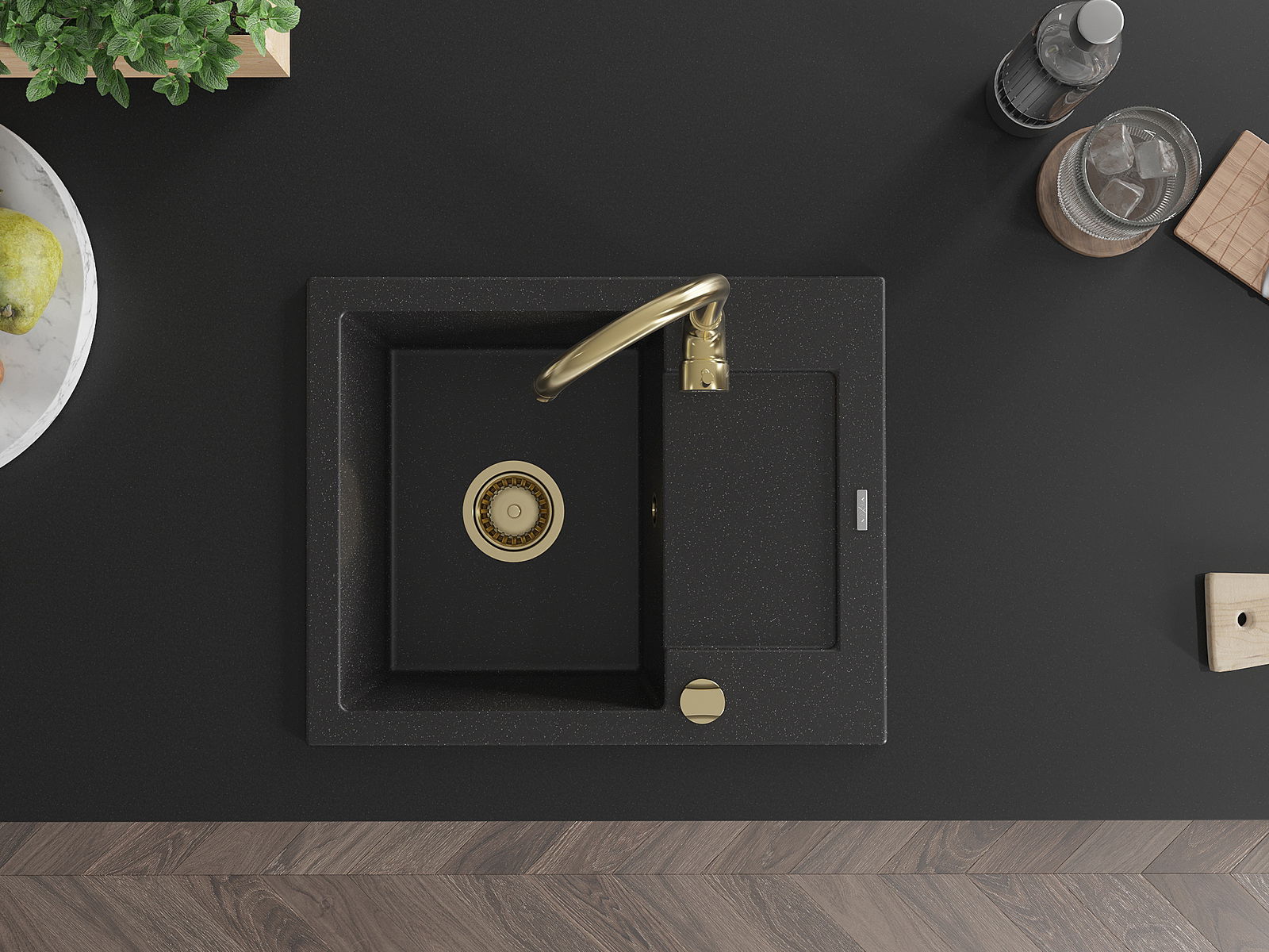 Mexen Enzo granitový kuchynský drez s 1 komorou s odkvapkávačom a kuchynskou batériou Telma, čierny/strieborný