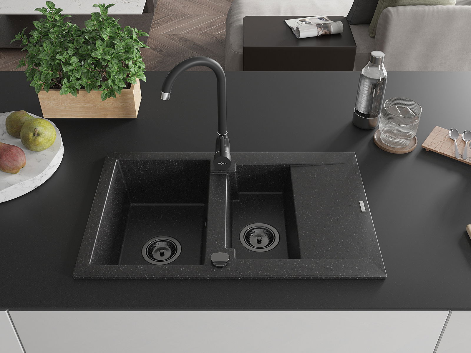 Mexen Gaspar žulový drez 1,5-komorový s odkvapkávačom a kuchynskou batériou Telma, čierno/strieborný - 6507-73-670200-70-B