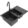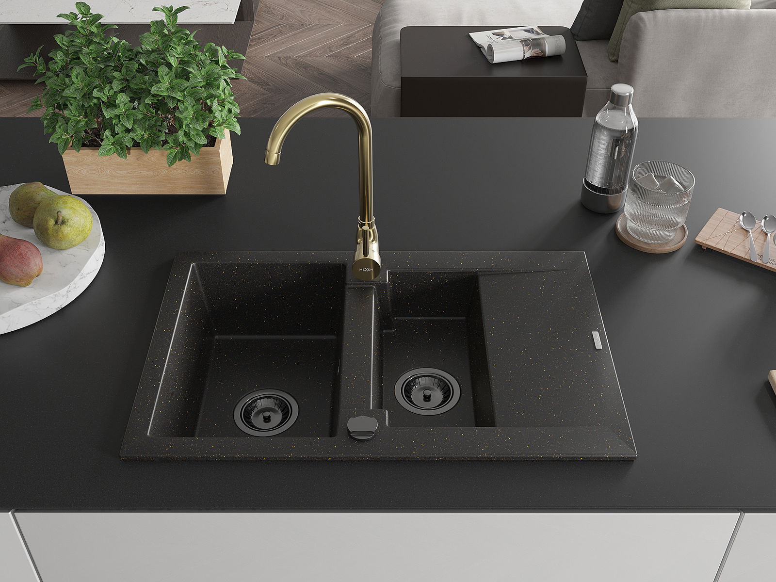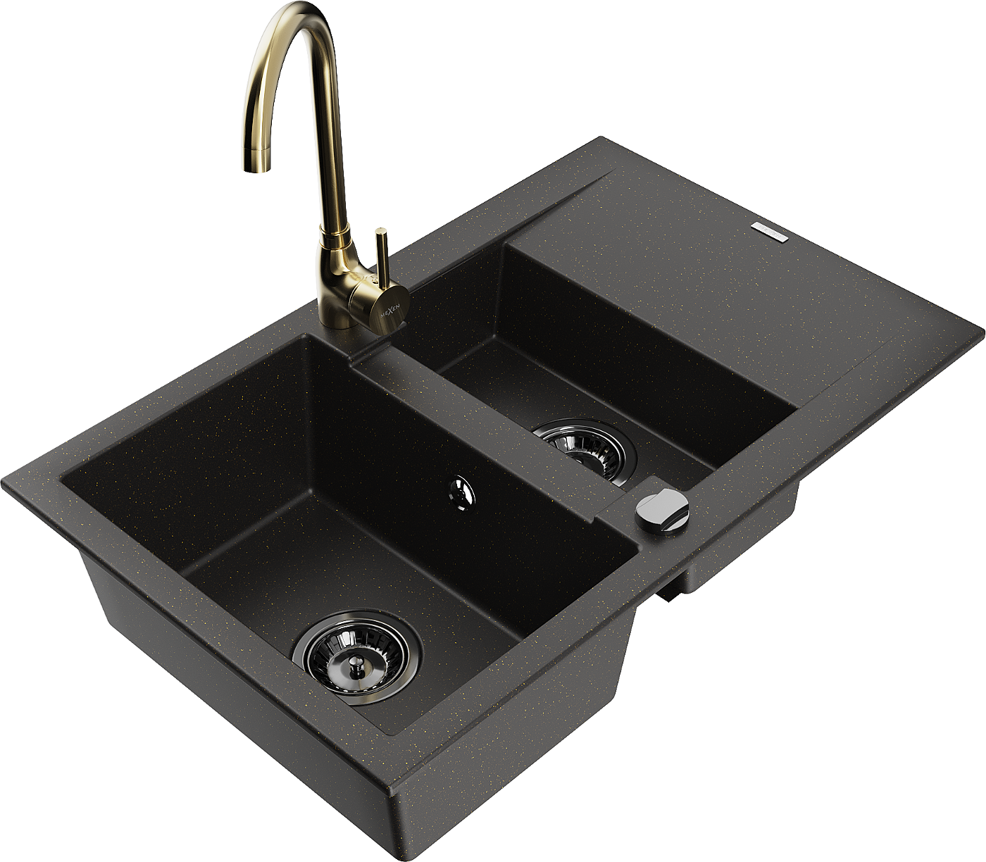 Mexen Gaspar granitový drez 1,5-komorový s odkvapkávačom a kuchynskou batériou Telma, čierny/zlatý - 6507-75-670200-50-B