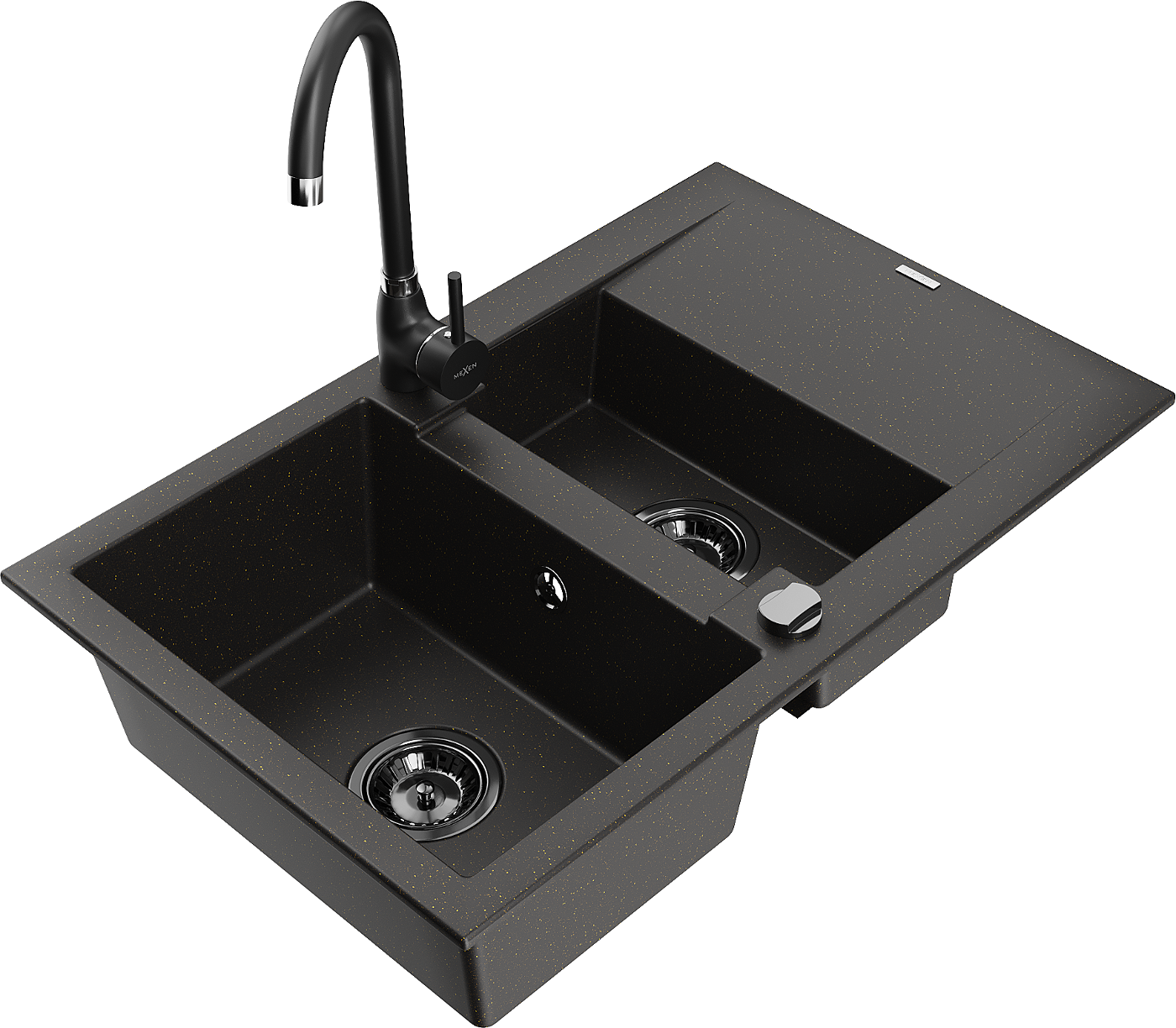 Mexen Gaspar žulový drez 1,5-komorový s odkvapkávacou plochou a kuchynskou batériou Telma, čierny/zlatý - 6507-75-670200-70-B