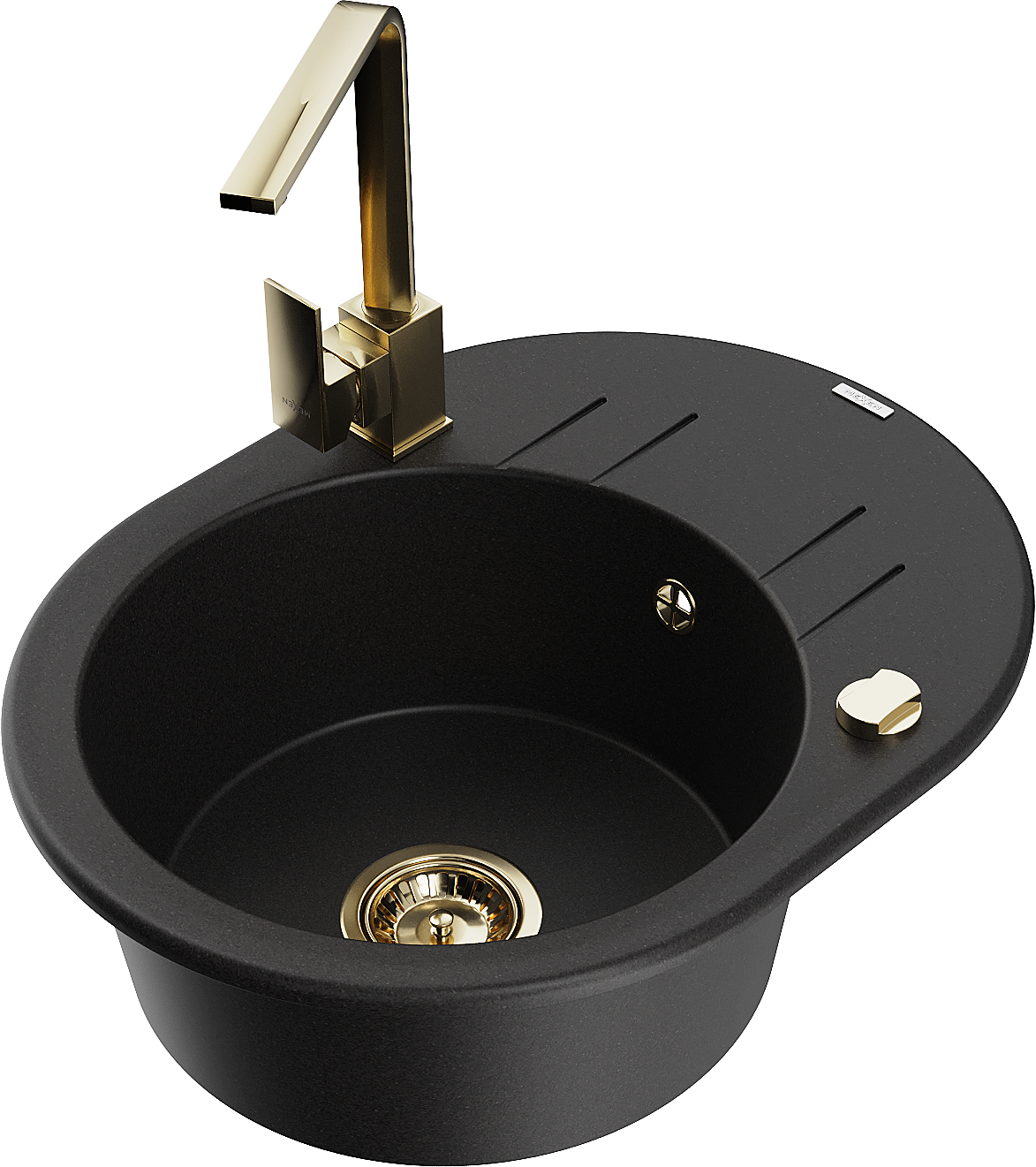 Mexen Kevin žulový kuchynský drez 1-komorový s odkvapávačom a kuchynskou batériou Rita, čierny - 6517-77-670300-50