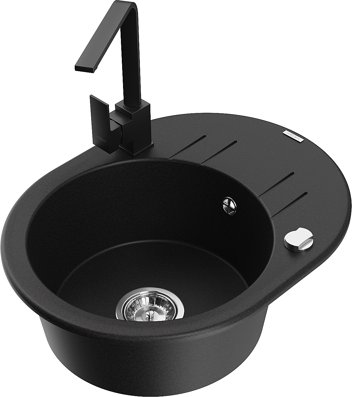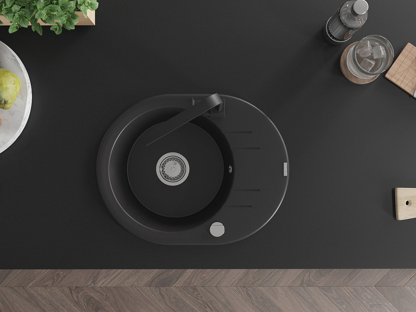 Mexen Kevin granitový kuchynský drez 1-komorový s odkvapkávačom a kuchynskou batériou Rita, čierny - 6517-77-670300-70