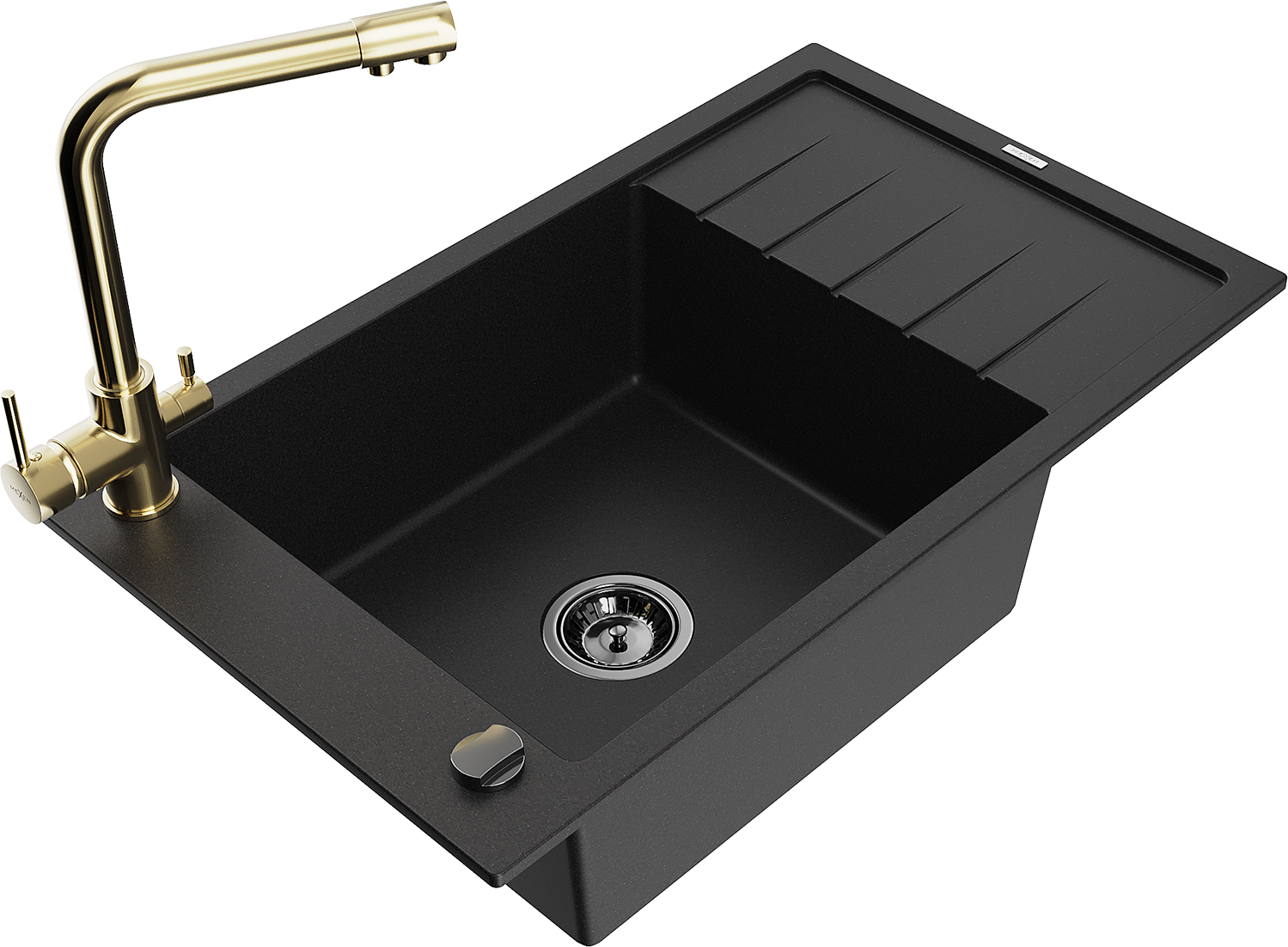 Mexen Elias žulový drez 1-komorový s odkvapkávačom a kuchynskou batériou Duero, čierny - 6511-77-671600-50-B