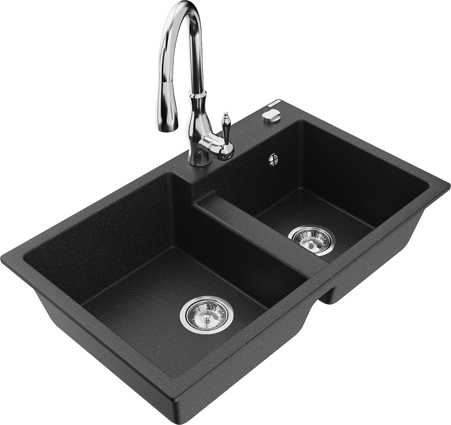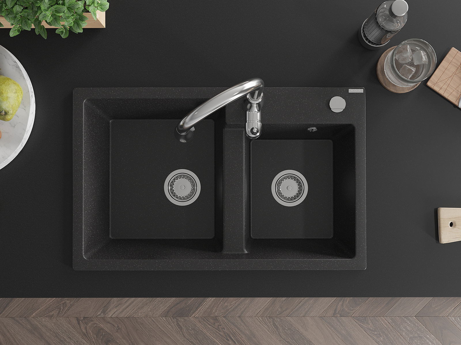 Mexen Tomas žulový drez 2-komorový s kuchynskou batériou Savita, čierny/strieborný metalický - 6516-73-672601-00