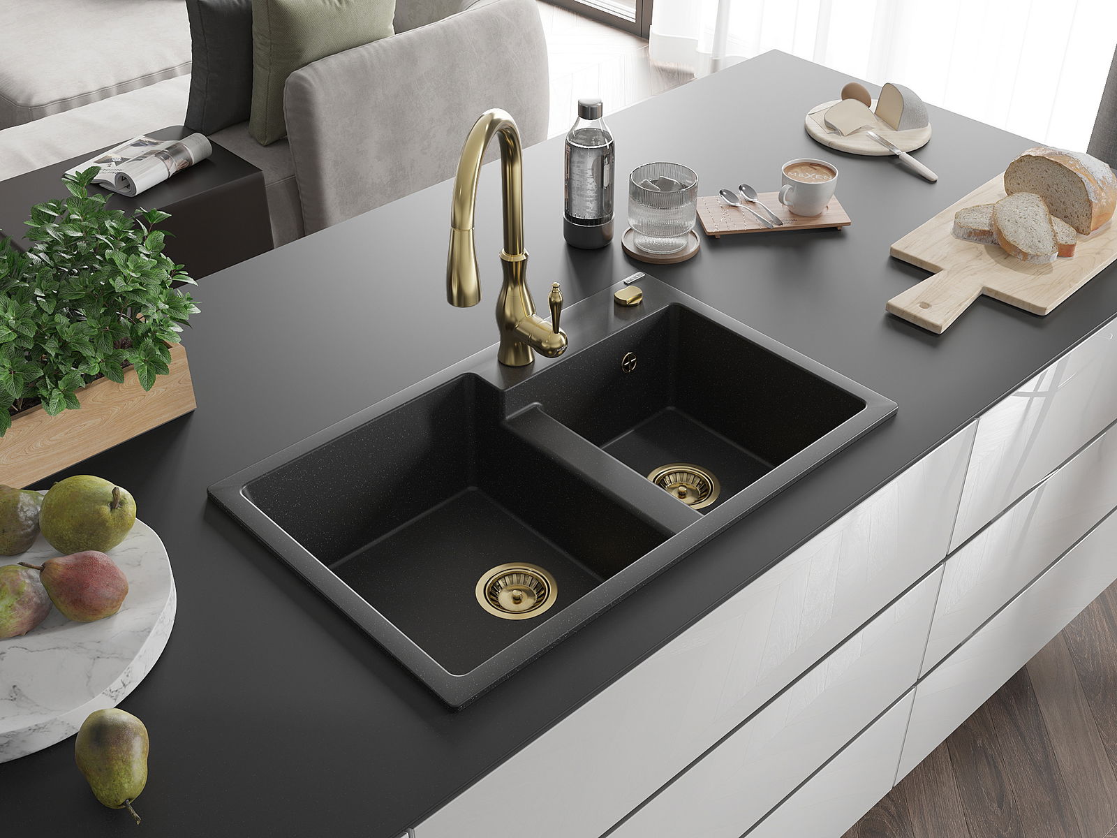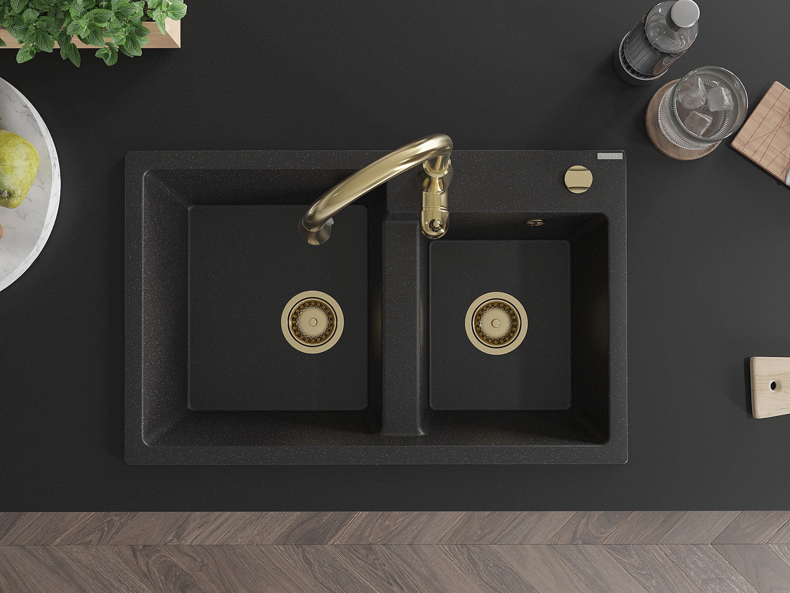 Mexen Tomas žulový drez 2-komorový s kuchynskou batériou Savita, čierny/strieborný metalický - 6516-73-672601-50