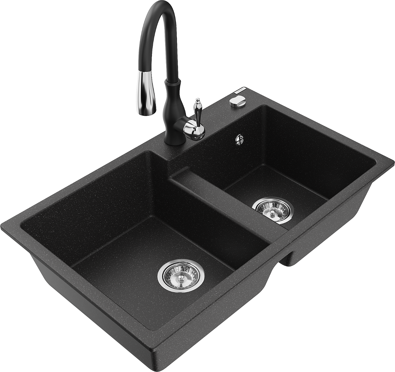 Mexen Tomas žulový drez s 2 komorami s kuchynskou batériou Savita, čierny/strieborný metalík - 6516-73-672601-70