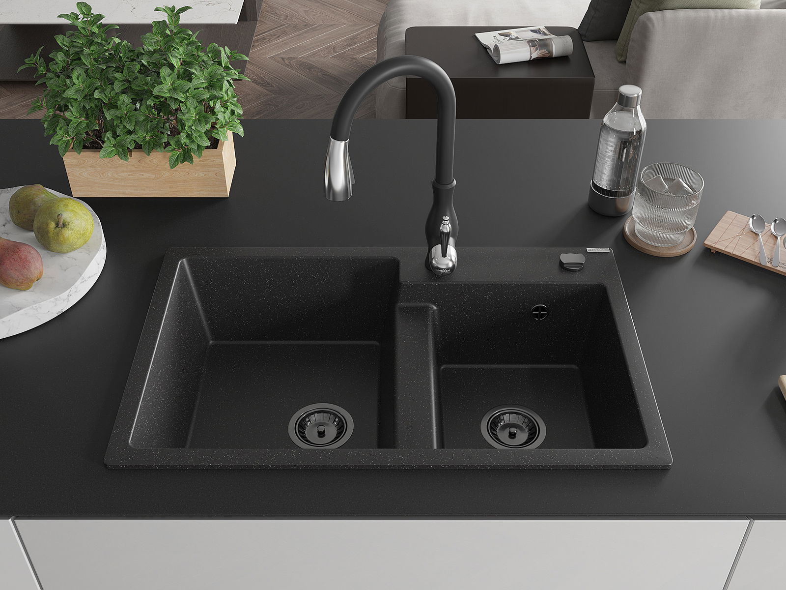 Mexen Tomas žulový drez s 2 komorami a kuchynskou batériou Savita, čierny/strieborný metalik - 6516-73-672601-70-B