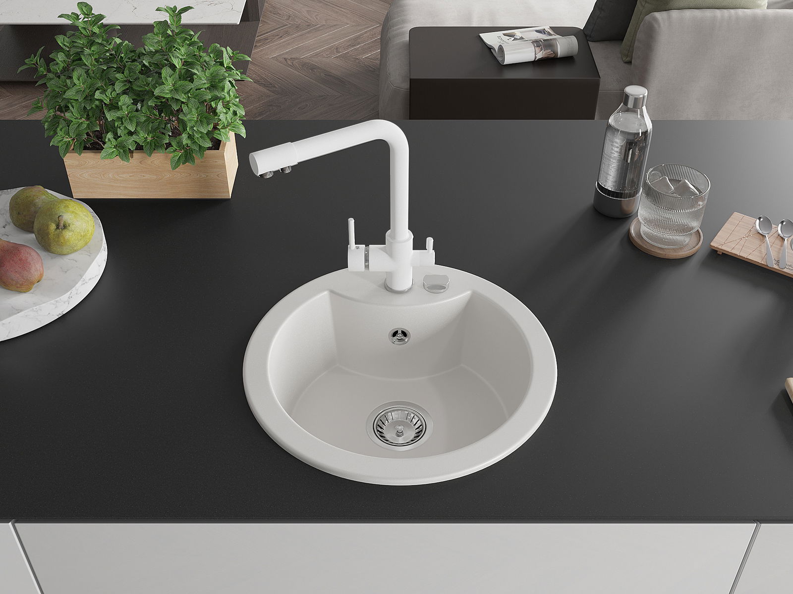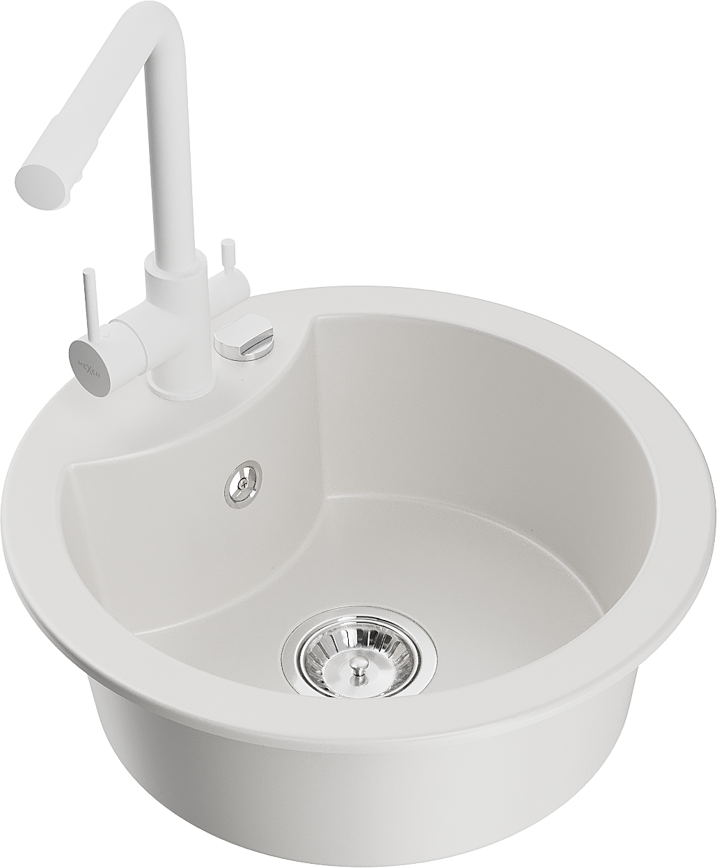 Mexen Diego granitový drez 1-komorový s kuchynskou batériou Duero, biely - 6512-20-671600-20