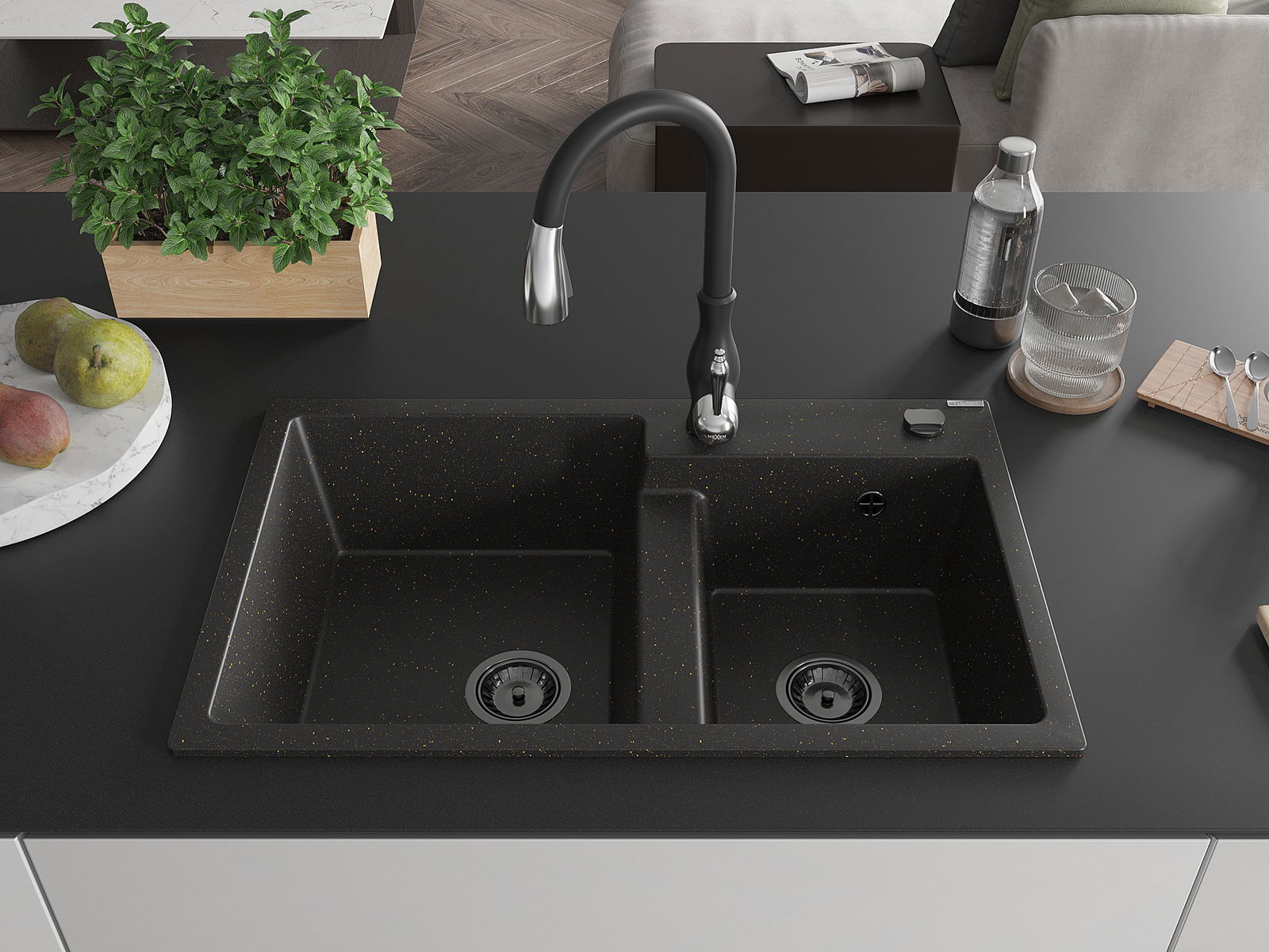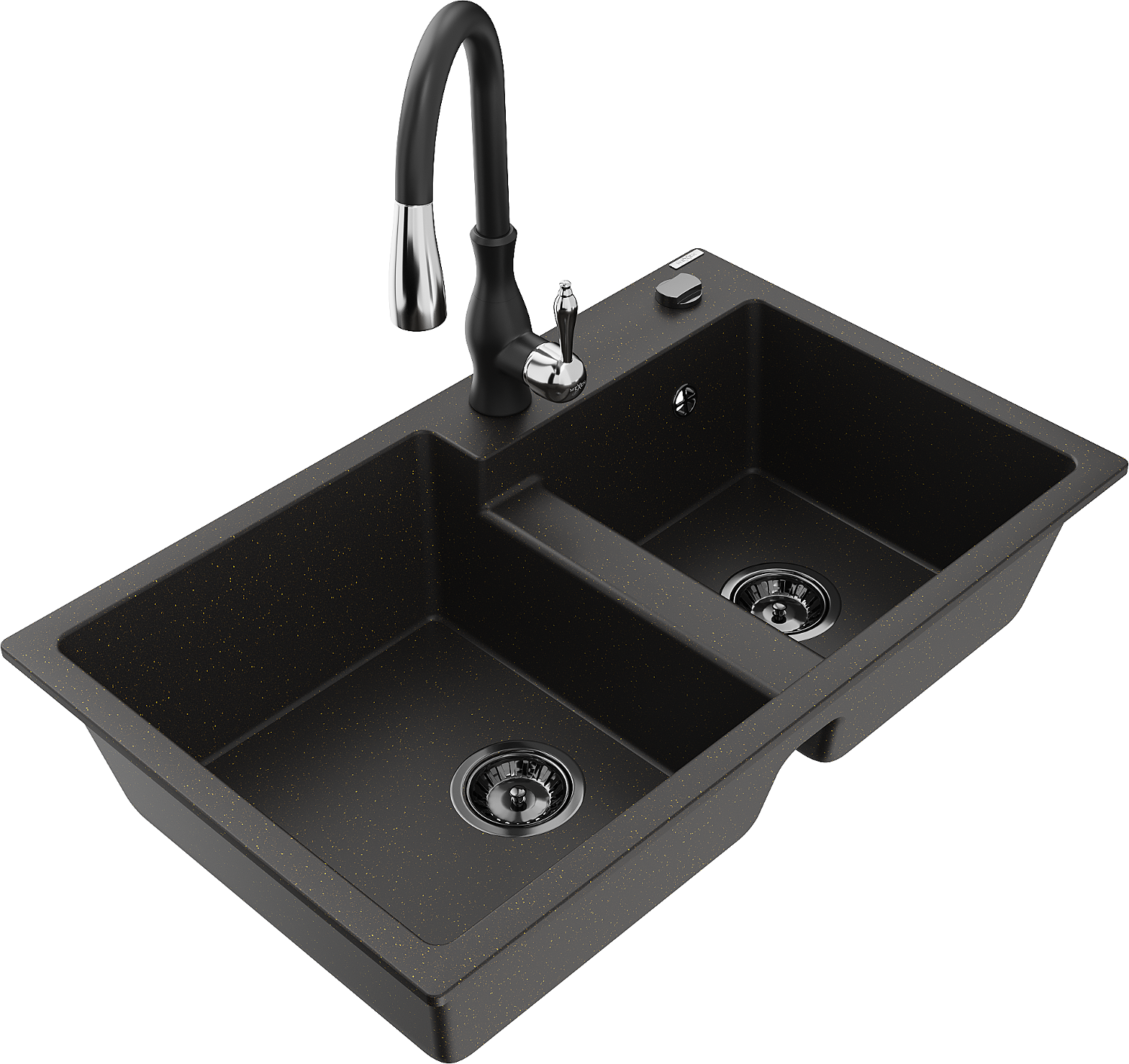 Mexen Tomas žulový dvojkomorový drez s kuchynskou batériou Savita, čierno/zlatý metalický - 6516-75-672601-70-B