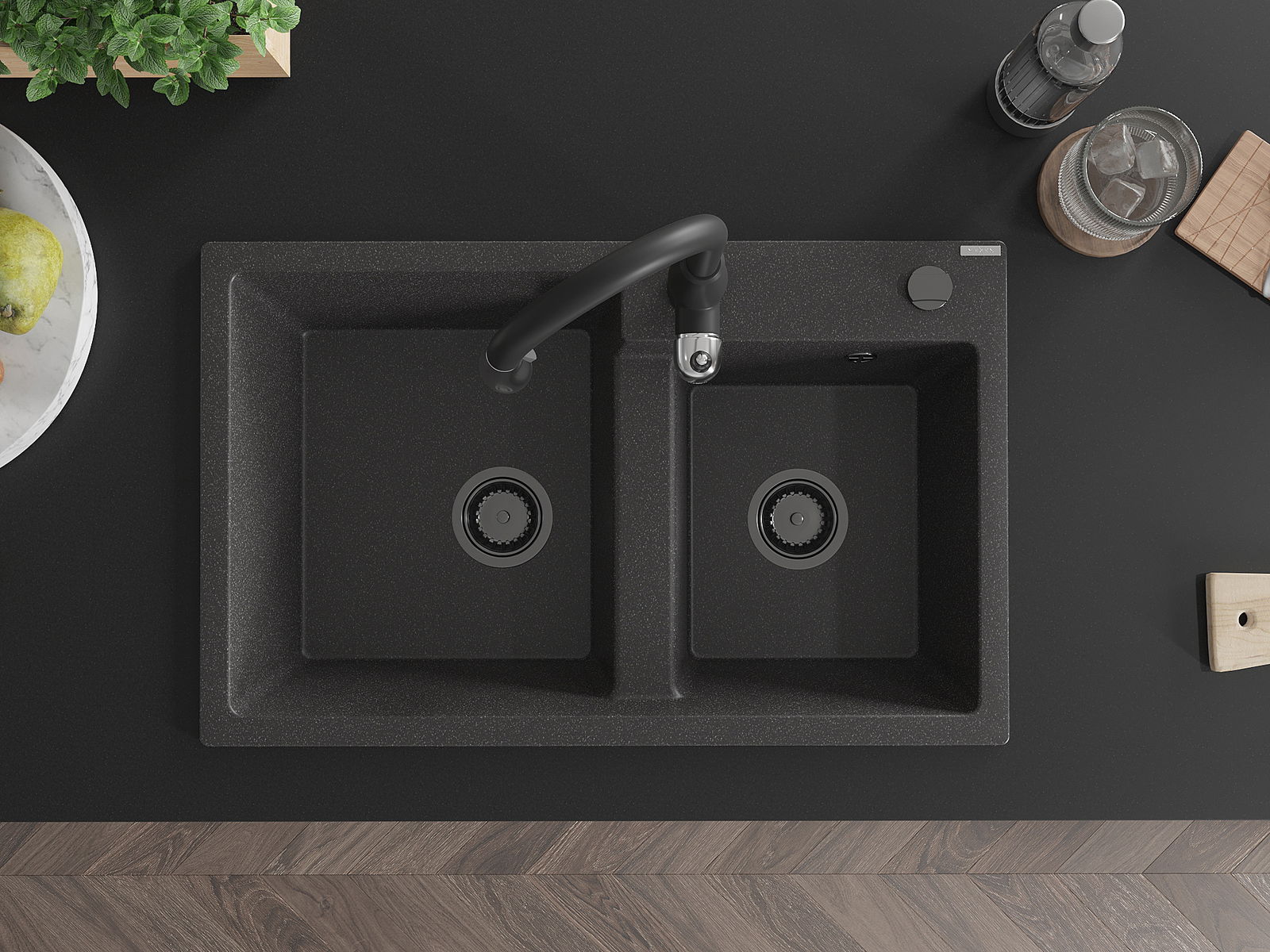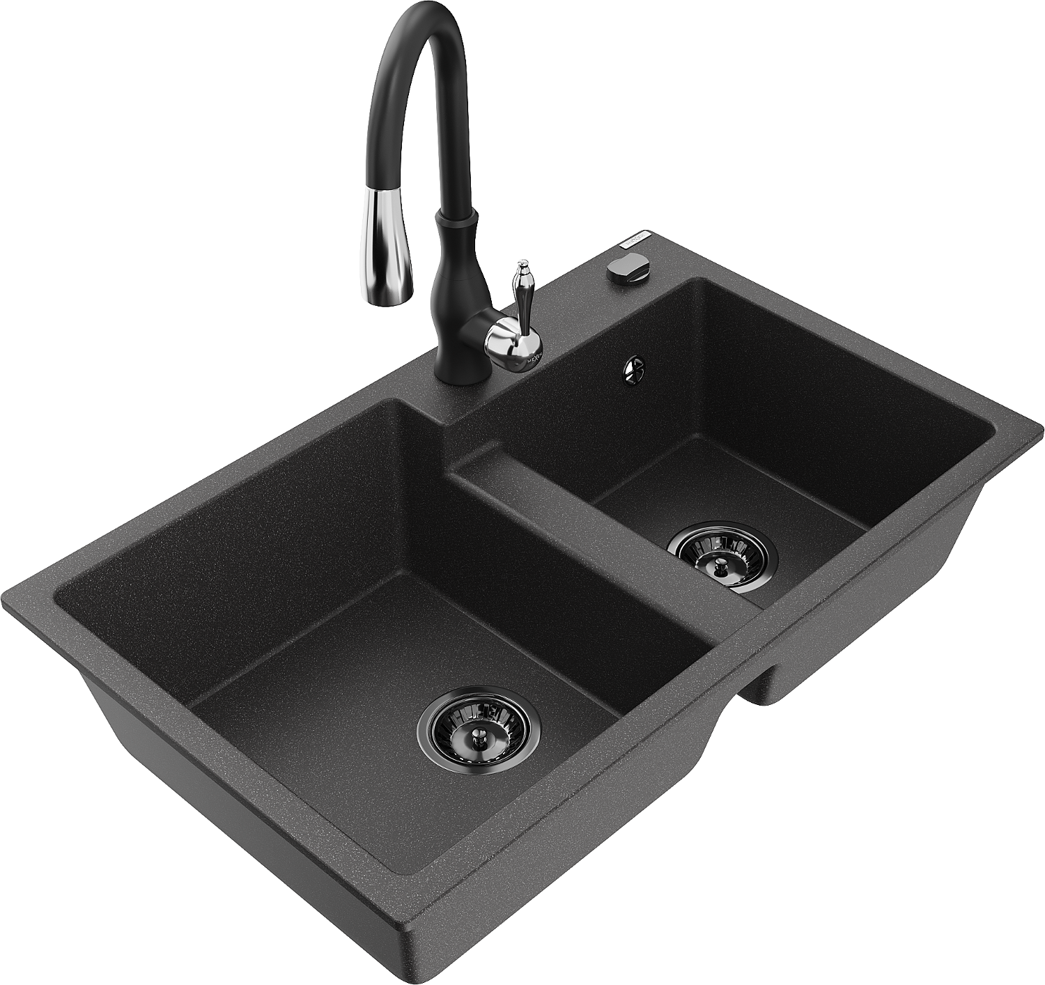 Mexen Tomas žulový drez s 2 komorami a kuchynskou batériou Savita, čierny škvrnitý - 6516-76-672601-70-B