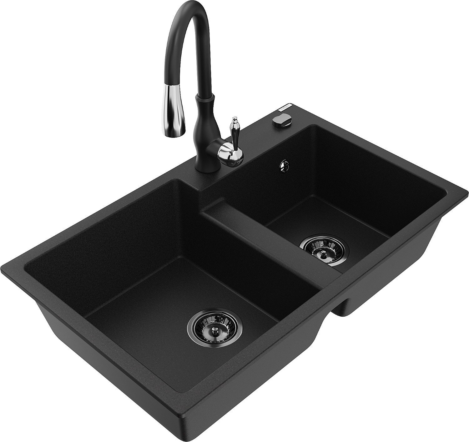 Mexen Tomas dvojkomorový granitový drez s kuchynskou batériou Savita, čierny - 6516-77-672601-70-B