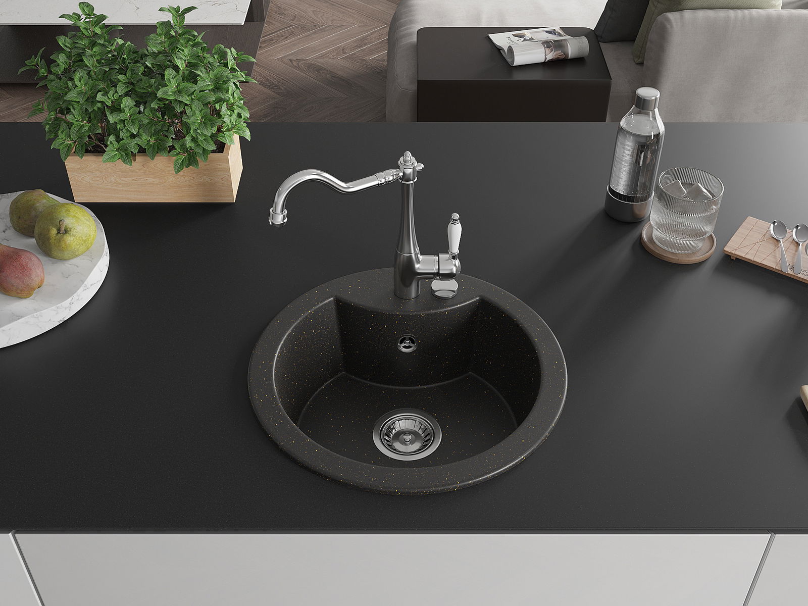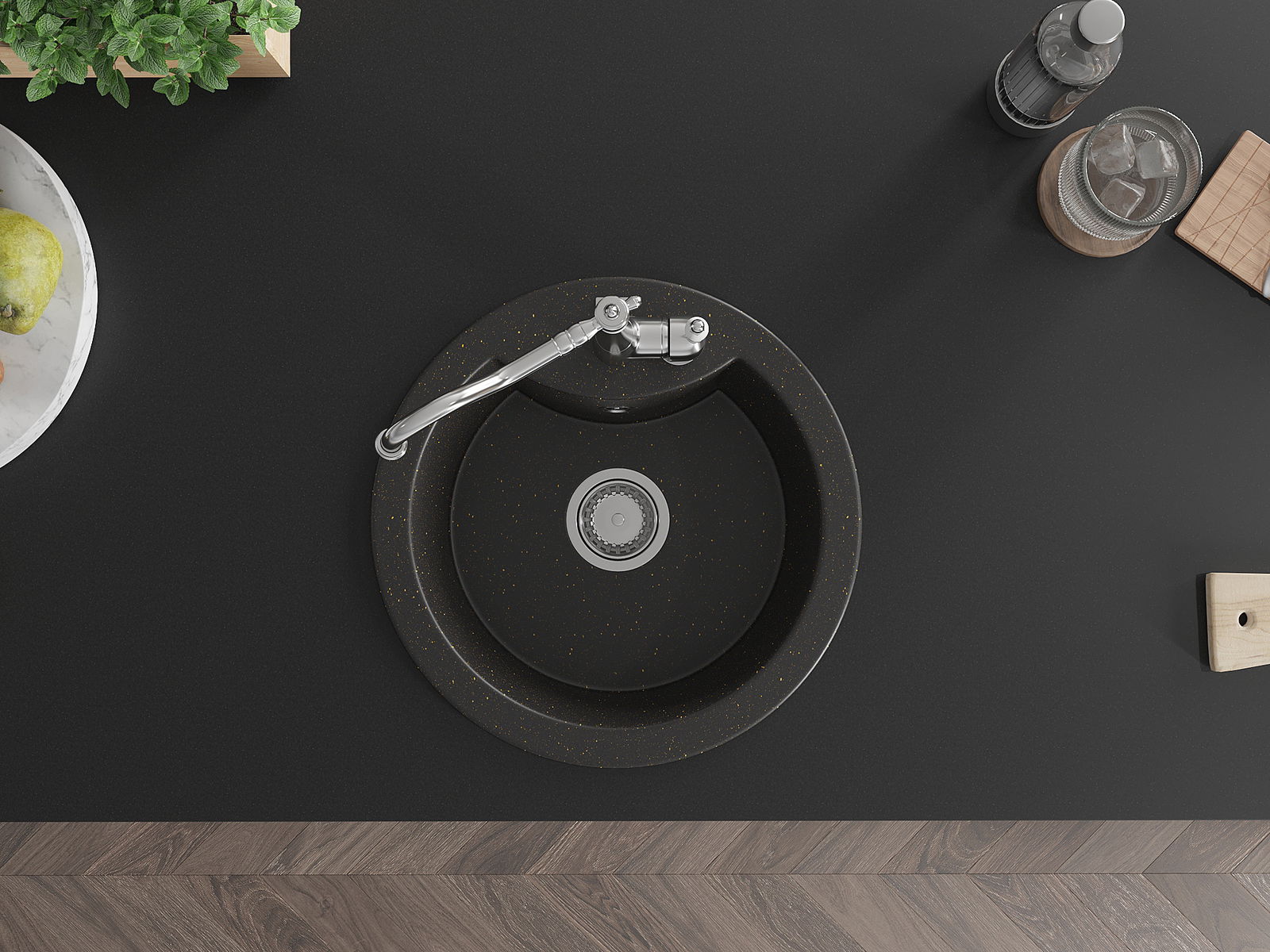 Mexen Diego granitový jednokomorový drez s kuchynskou batériou Carla, čierny/zlatý metalik - 6512-75-670700-00