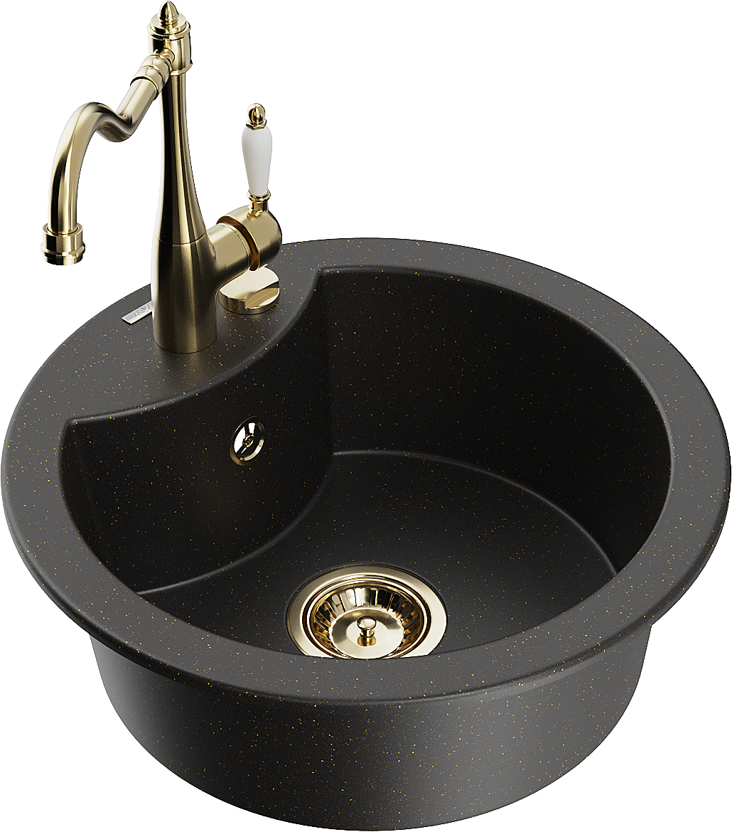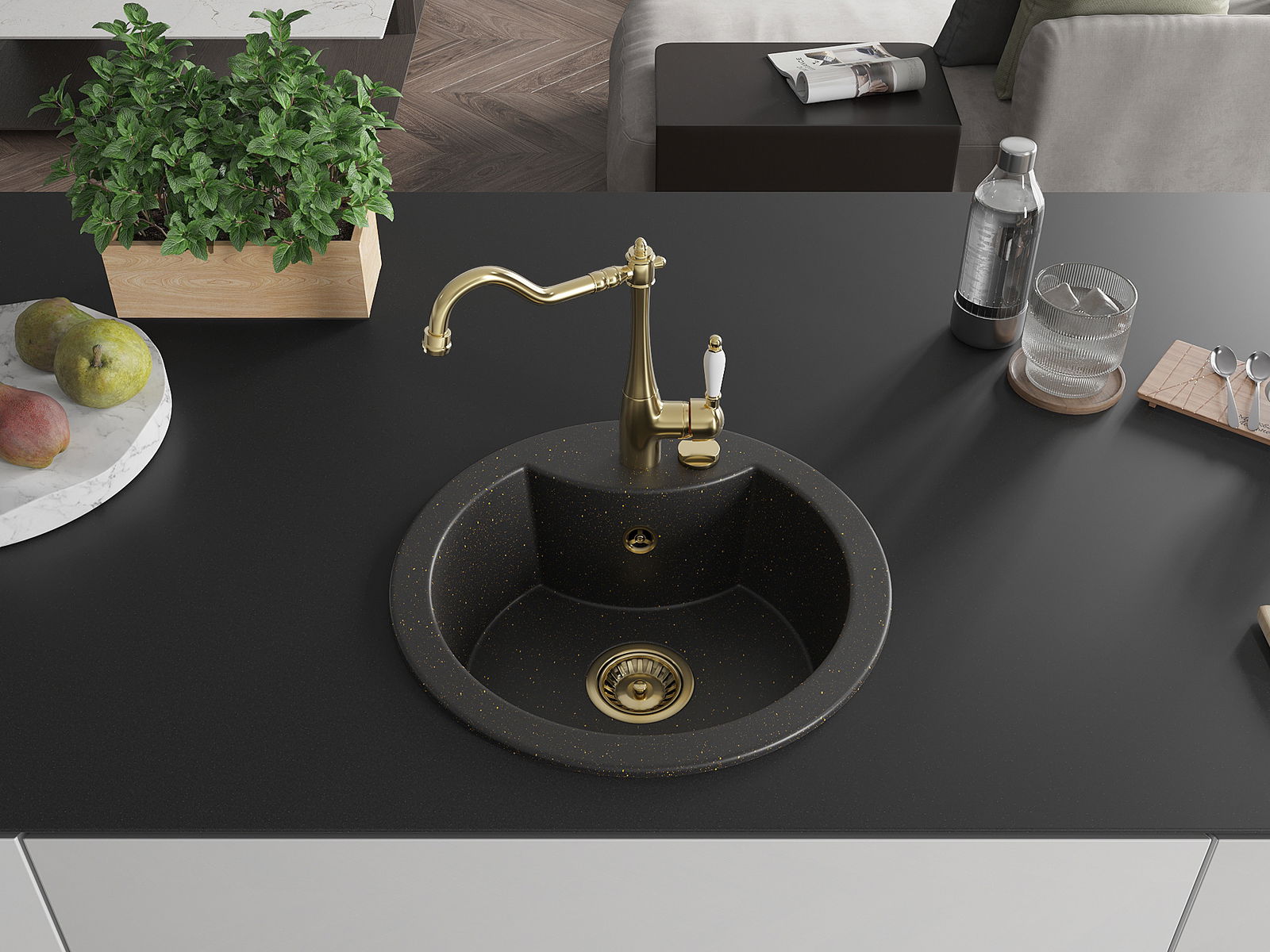 Mexen Diego žulový jedno-komorový drez s kuchynskou batériou Carla, čierny/zlatý metalik - 6512-75-670700-50