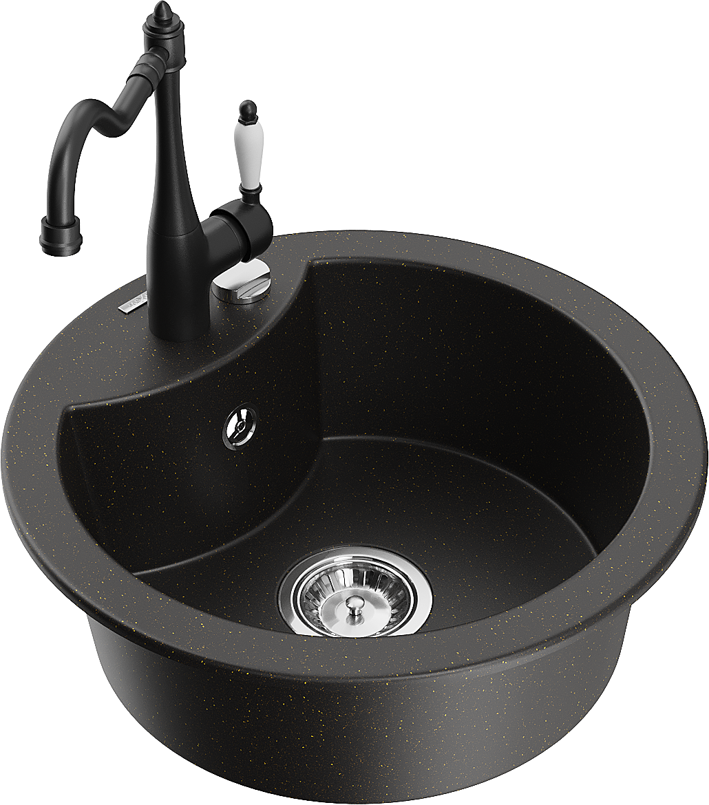 Mexen Diego žulový drez 1-komorový s kuchynskou batériou Carla, čierny/zlatý metalik - 6512-75-670700-70
