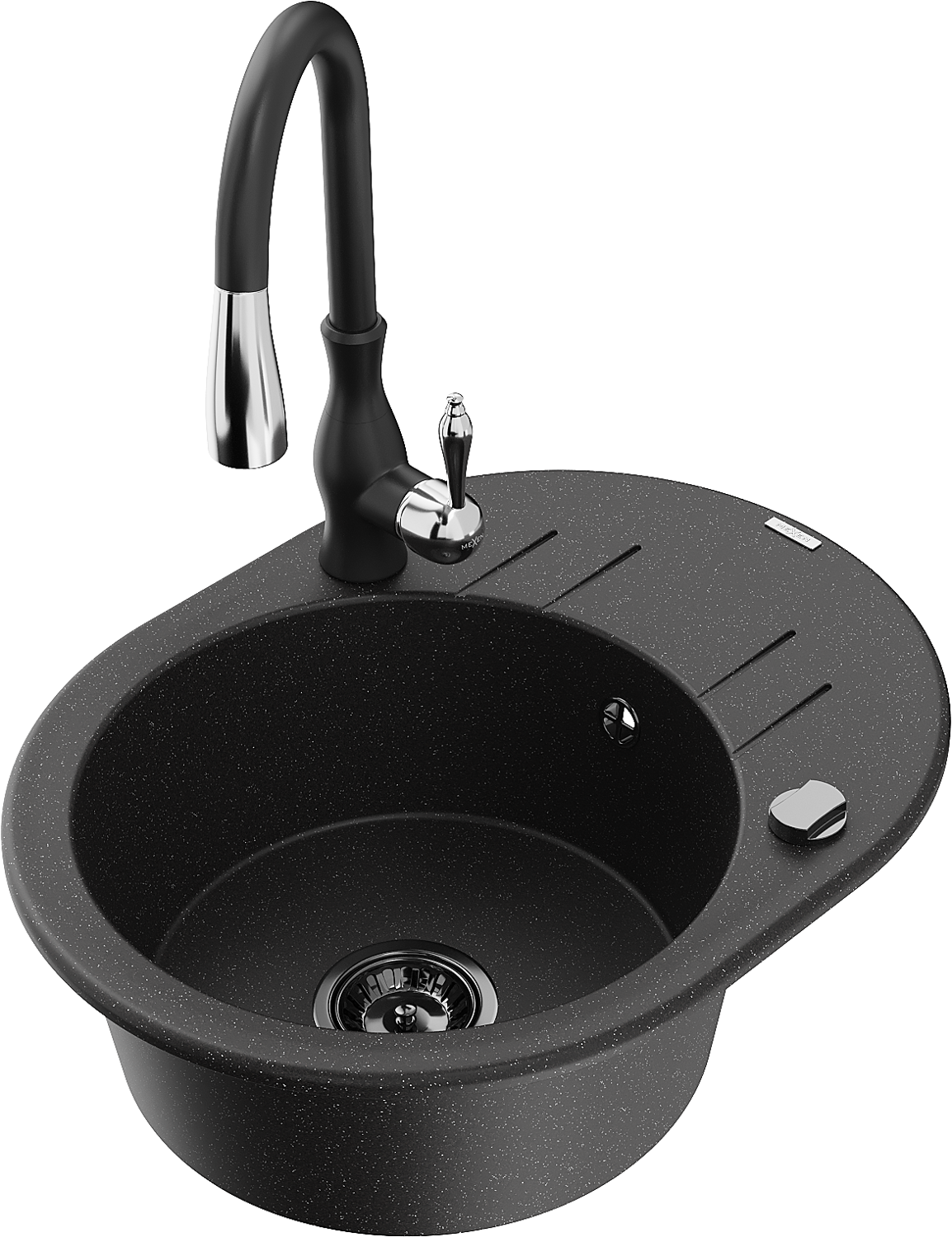 Mexen Kevin granitový drez 1-komorový s odkvapkávačom a kuchynskou batériou Savita, čierny/strieborný - 6517-73-672601-70-B