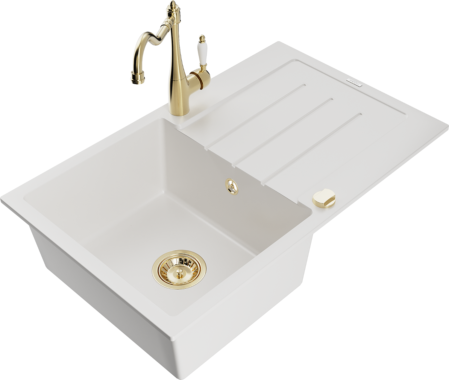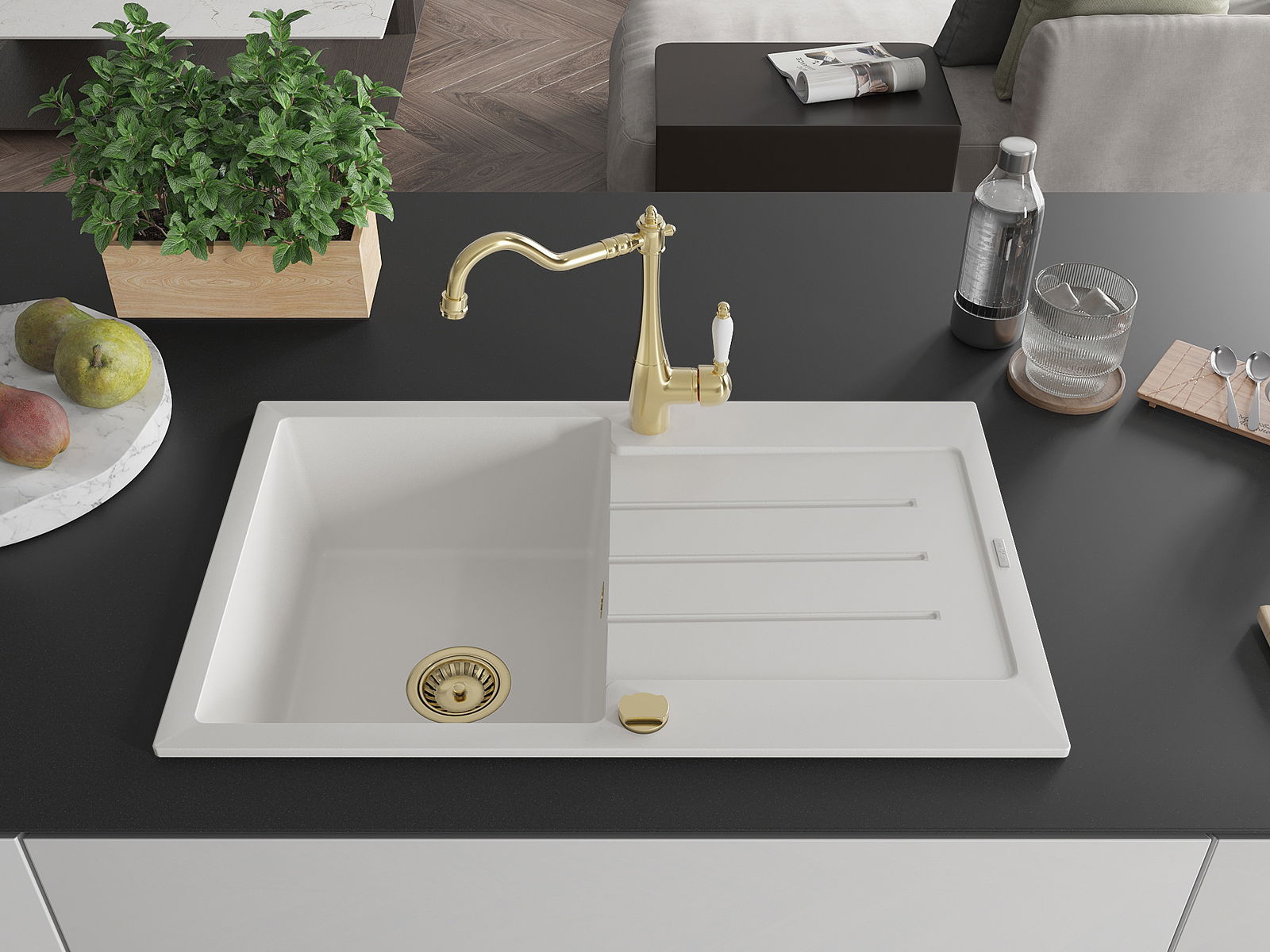 Mexen Bruno žulový drez 1-komorový s odkvapkávačom a kuchynskou batériou Carla, biela - 6513-20-670700-50