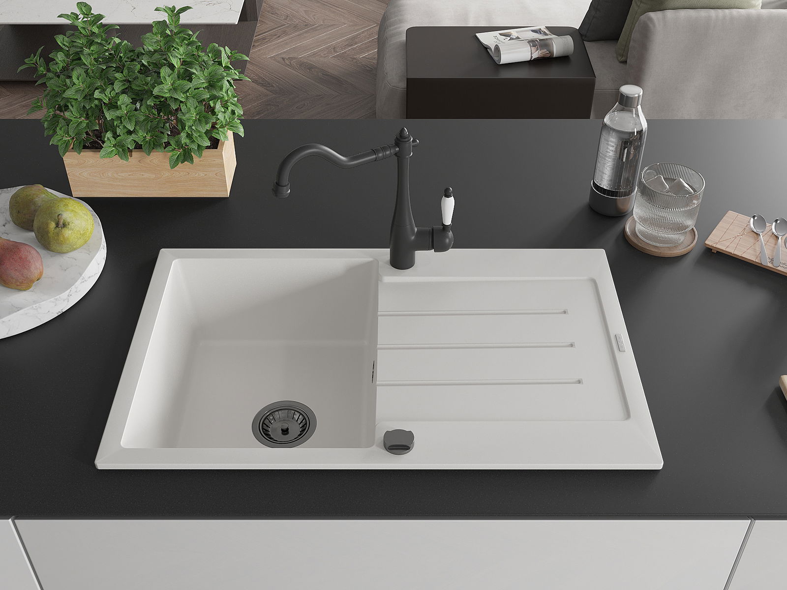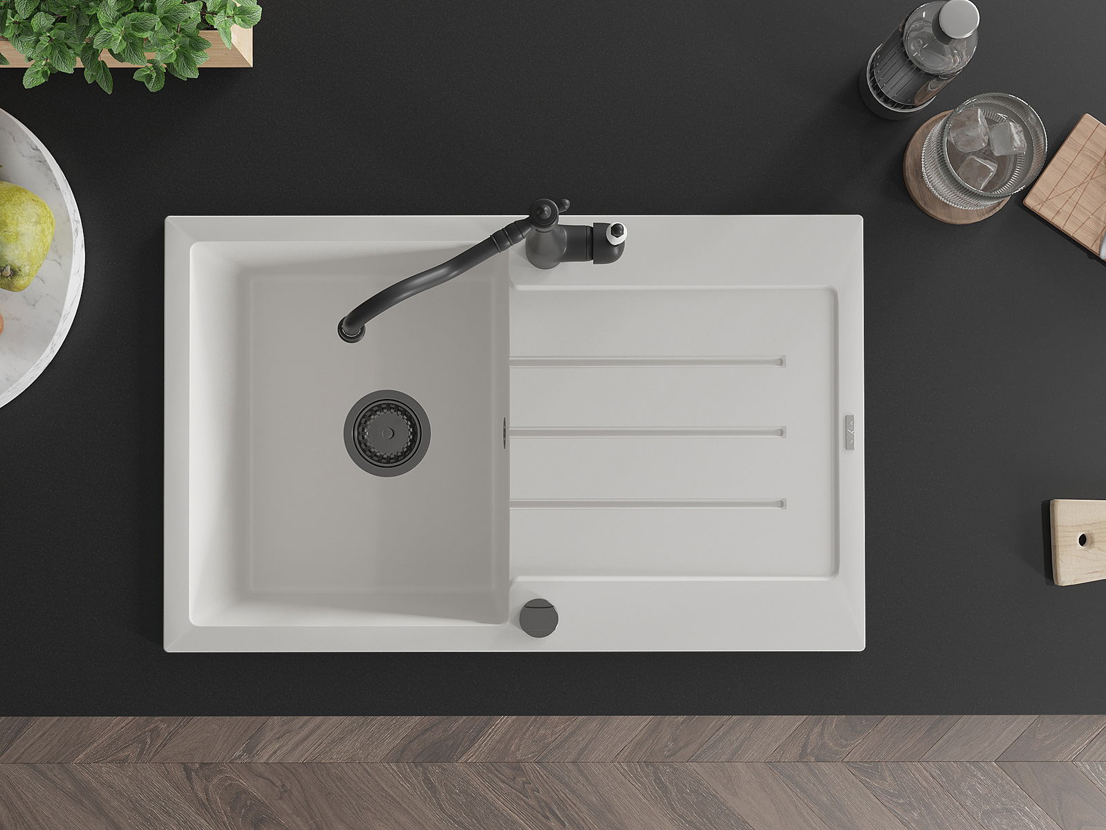Povrch kuchynského drezu je odolný voči škvrnám a zafarbeniu, vďaka čomu sa ľahko udržiava a zachováva svoju farbu počas dlhého obdobia používania. Estetický a praktický doplnok pre každú kuchyňu.