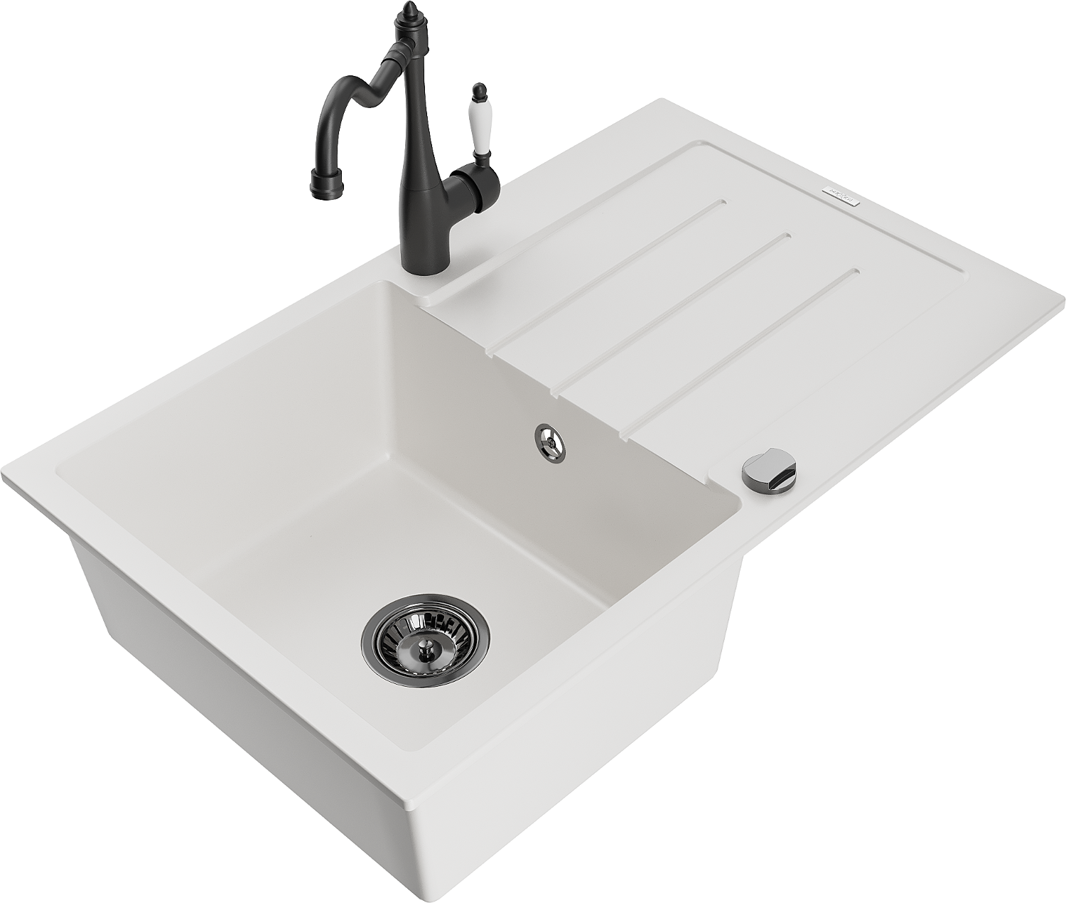 Mexen Bruno žulový drez s odkvapkávačom a kuchynskou batériou Carla, biely - 6513-20-670700-70