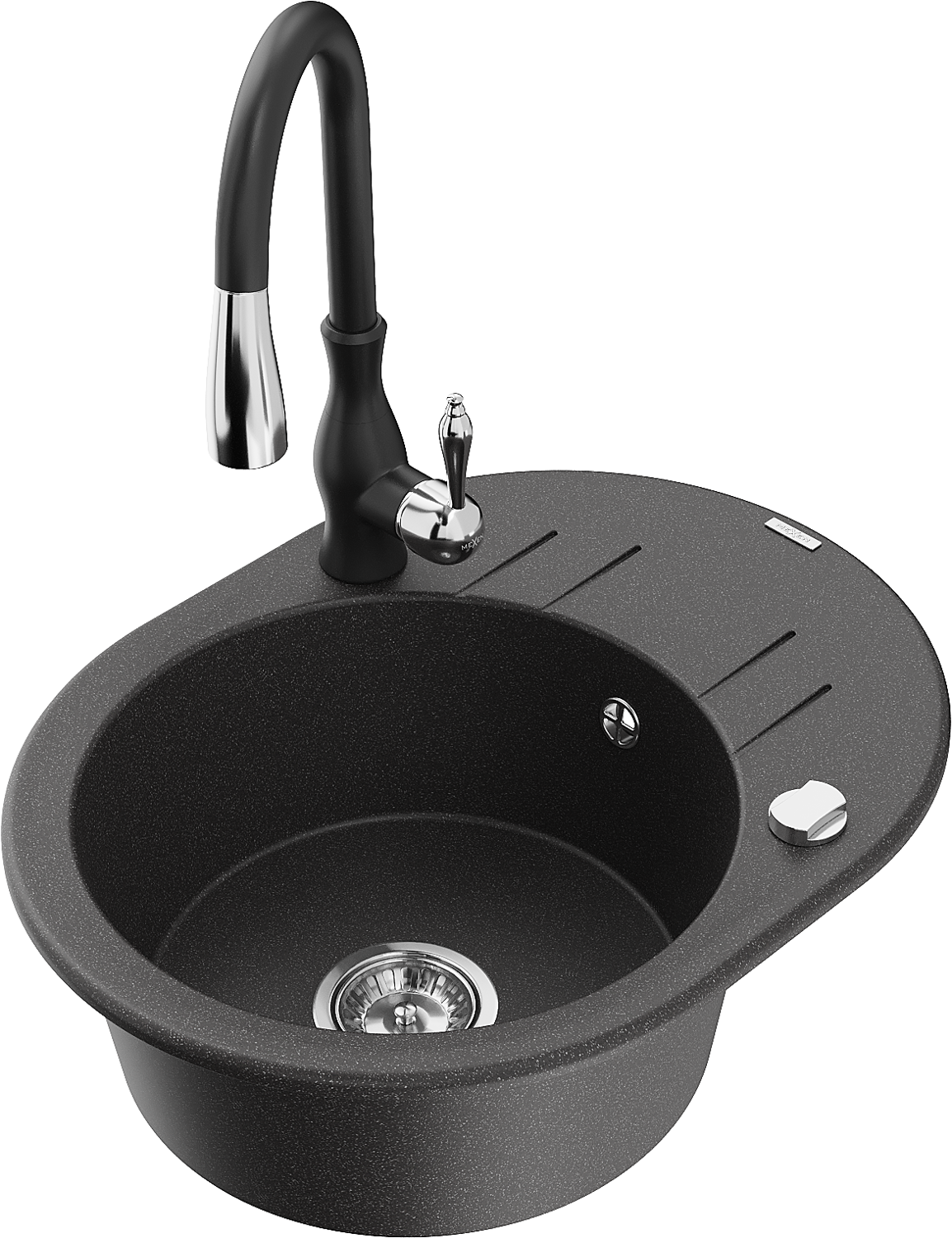 Mexen Kevin žulový jednokomorový drez s odkvapkávačom a kuchynskou batériou Savita, čierny škvrnitý - 6517-76-672601-70