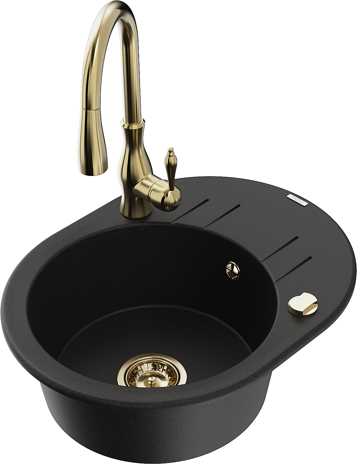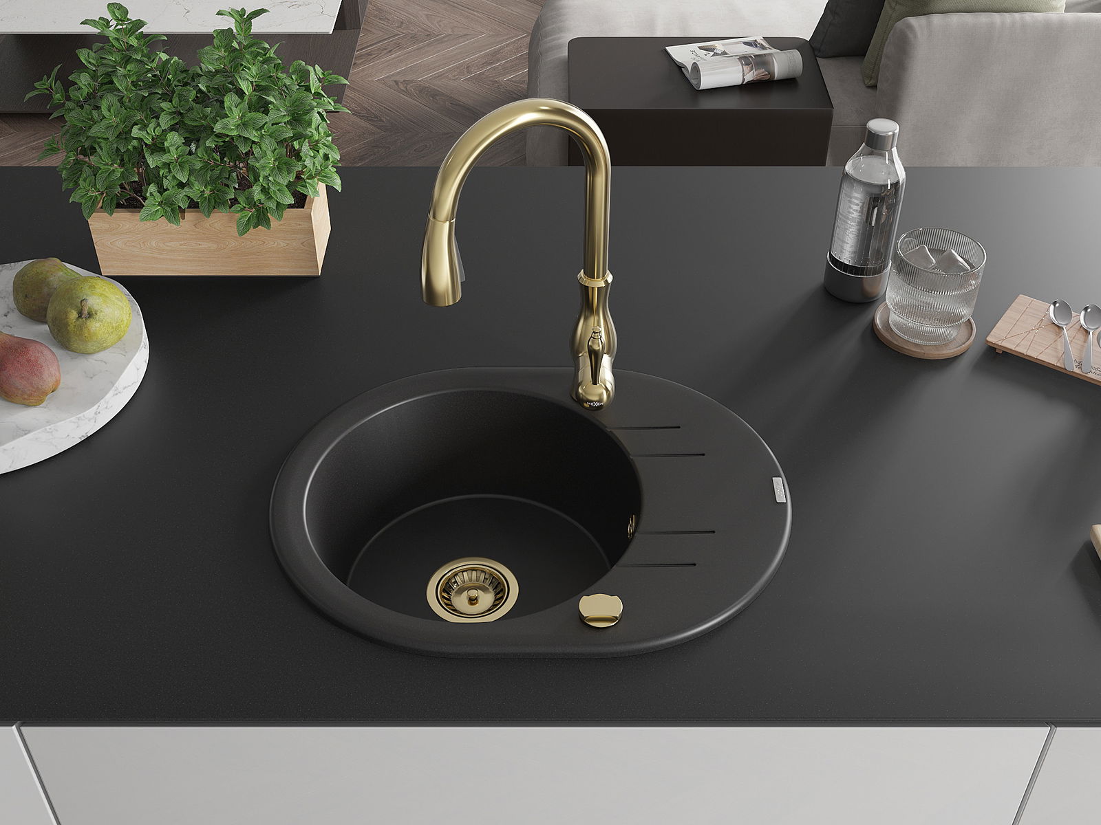 Mexen Kevin žulový jednokomorový drez s odkvapkávačom a kuchynskou batériou Savita, čierna - 6517-77-672601-50