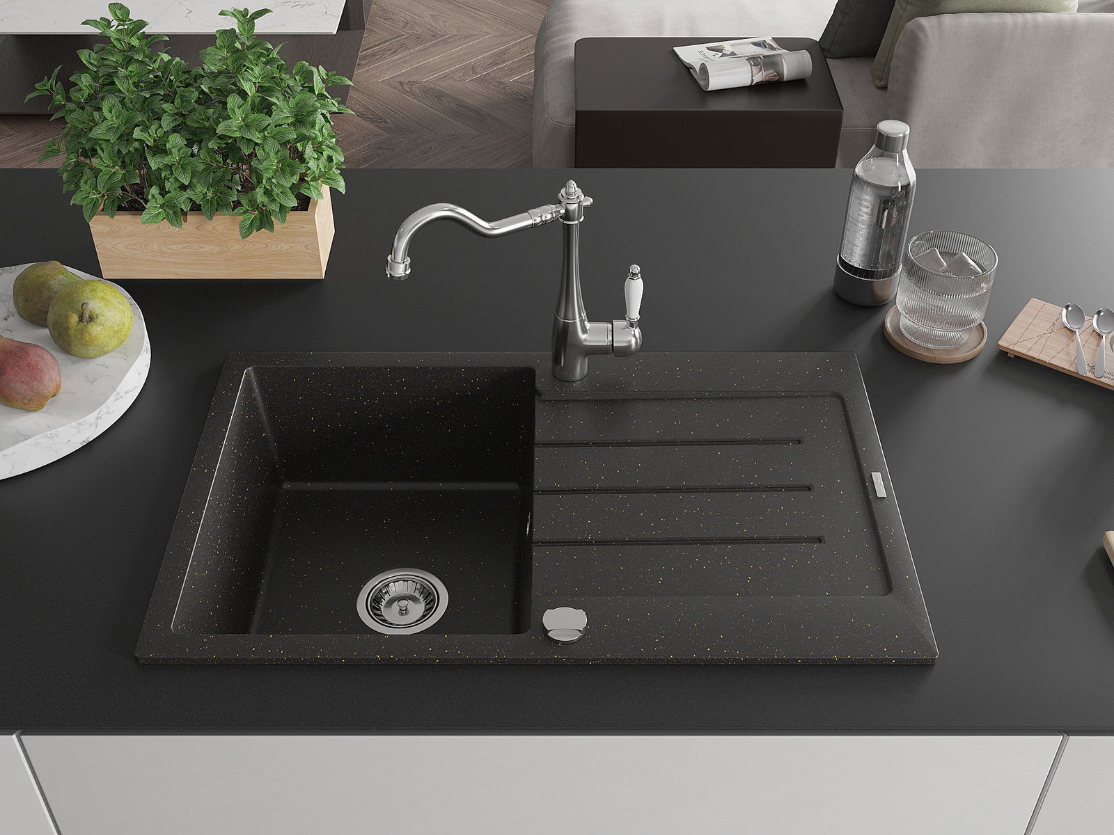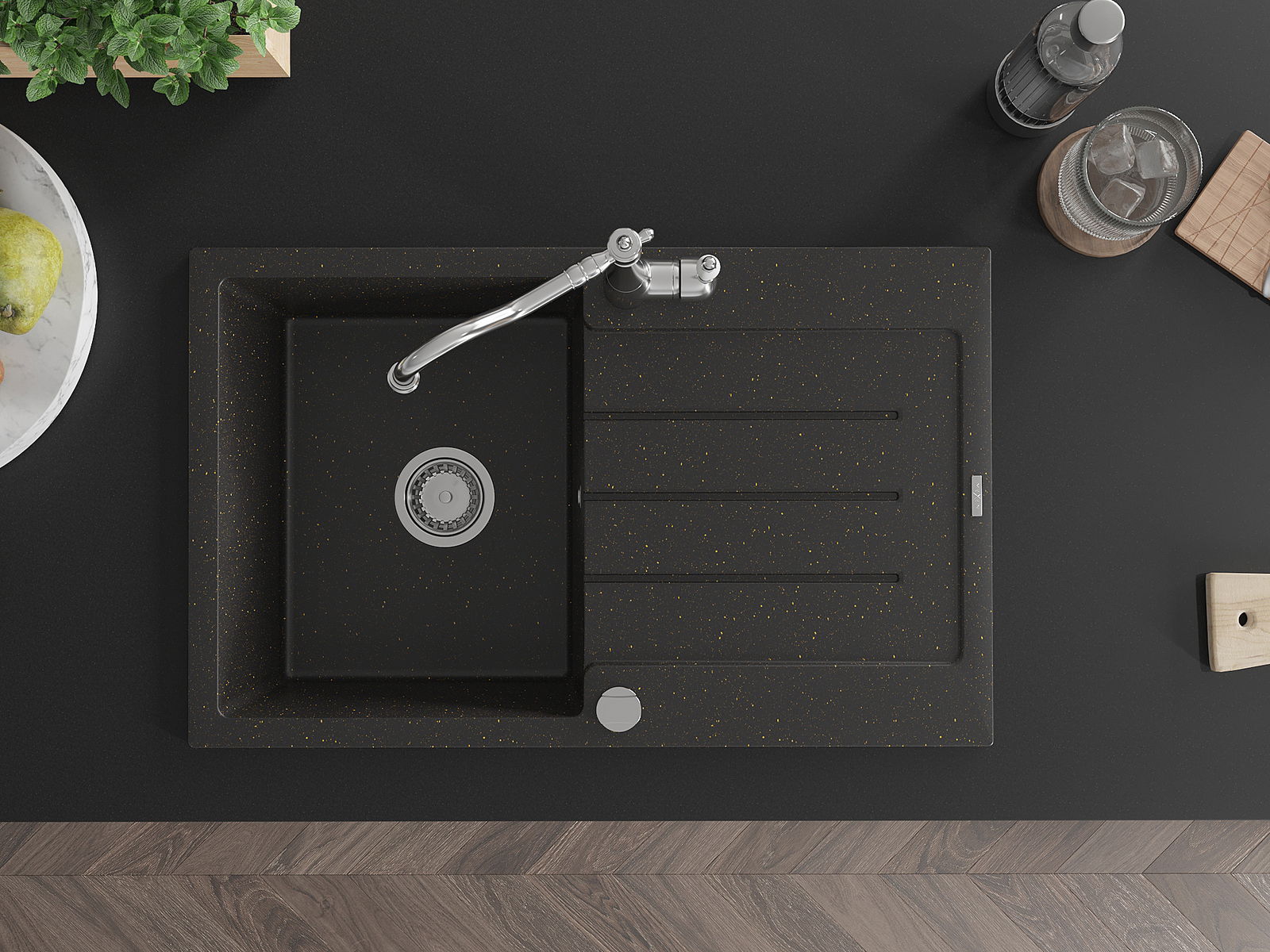 Drez bol vyrobený z vysoko kvalitného granitu. Predstavuje elegantné, ale predovšetkým praktické doplnenie každej kuchyne, nezávisle od jej štýlu. Vysoká kvalita a trvácnosť granitu zaisťujú dlhodobé používanie.