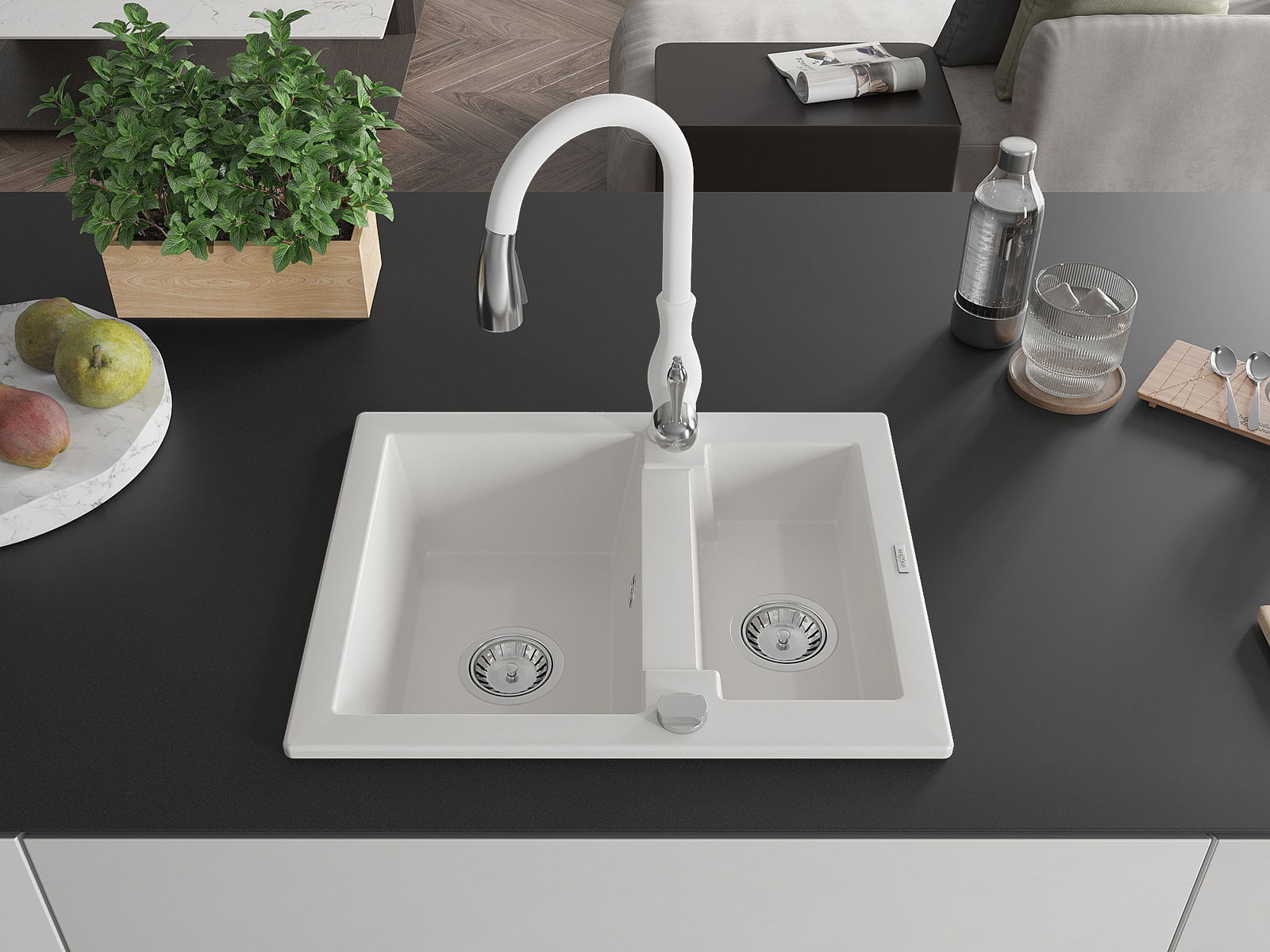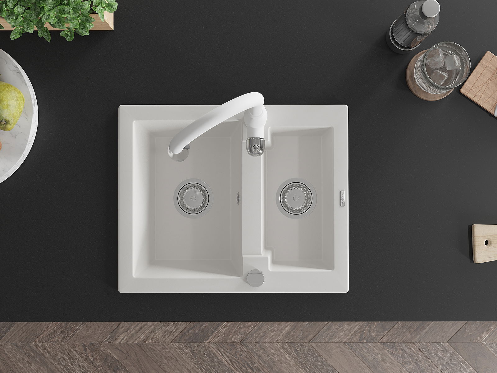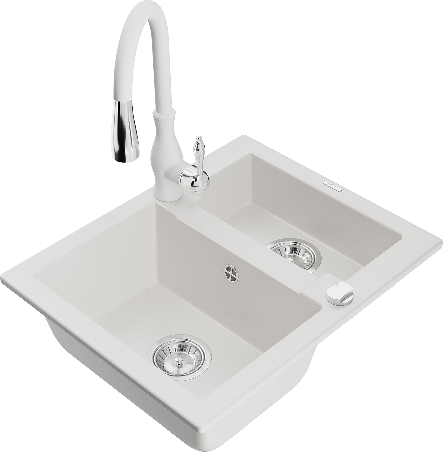Mexen Carlos žulový drez 1,5-komorový s kuchynskou batériou Savita, biely - 6518-20-672601-20