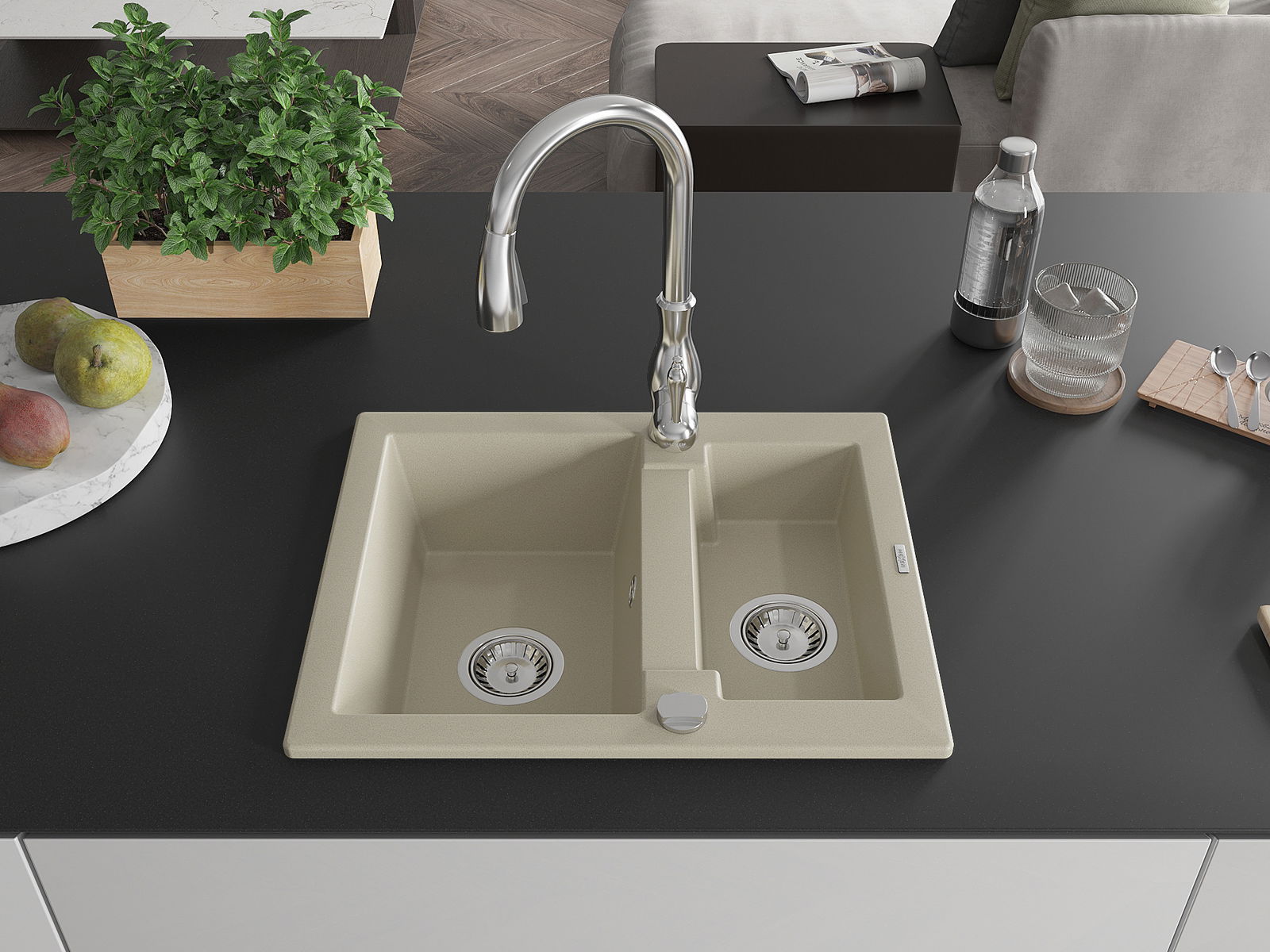 Povrch kuchynského drezu je odolný voči škvrnám a zafarbeniu, vďaka čomu sa ľahko udržiava a zachováva svoju farbu počas dlhého obdobia používania. Estetický a praktický doplnok pre každú kuchyňu.