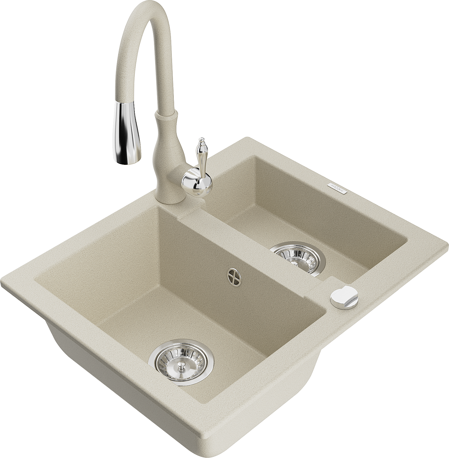 Mexen Carlos granitový kuchynský drez s 1,5 komorou a kuchynskou batériou Savita, béžový - 6518-69-672601-69