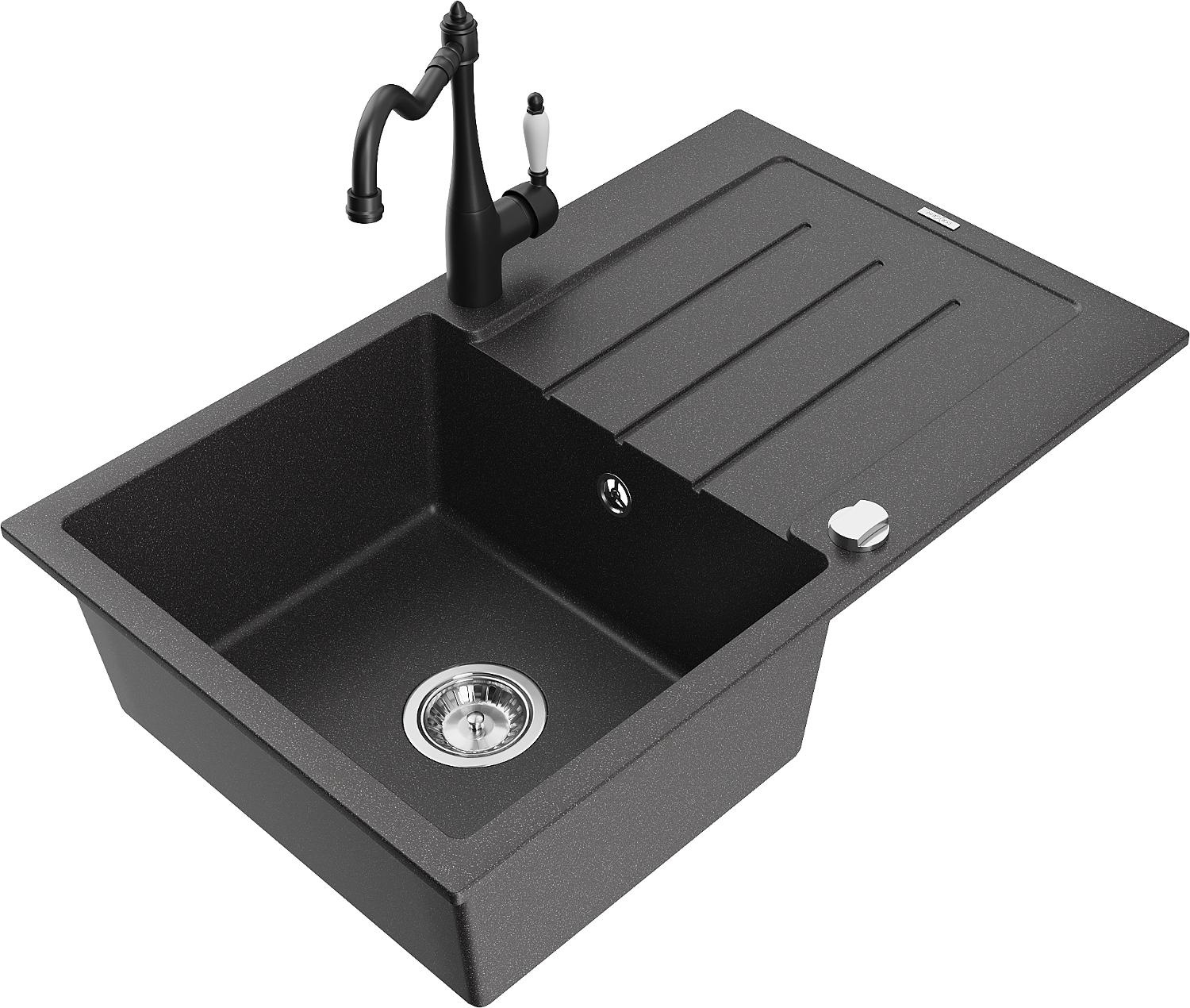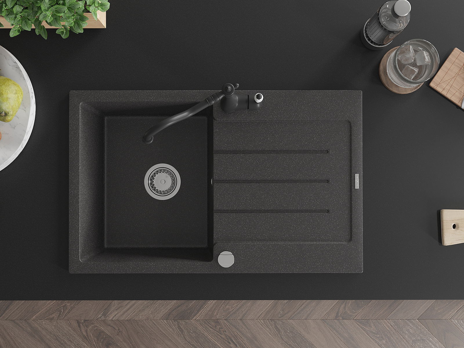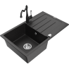 Mexen Bruno žulový kuchynský drez 1-komorový s odkapávačom a kuchynskou batériou Carla, čierny striekaný - 6513-76-670700-70