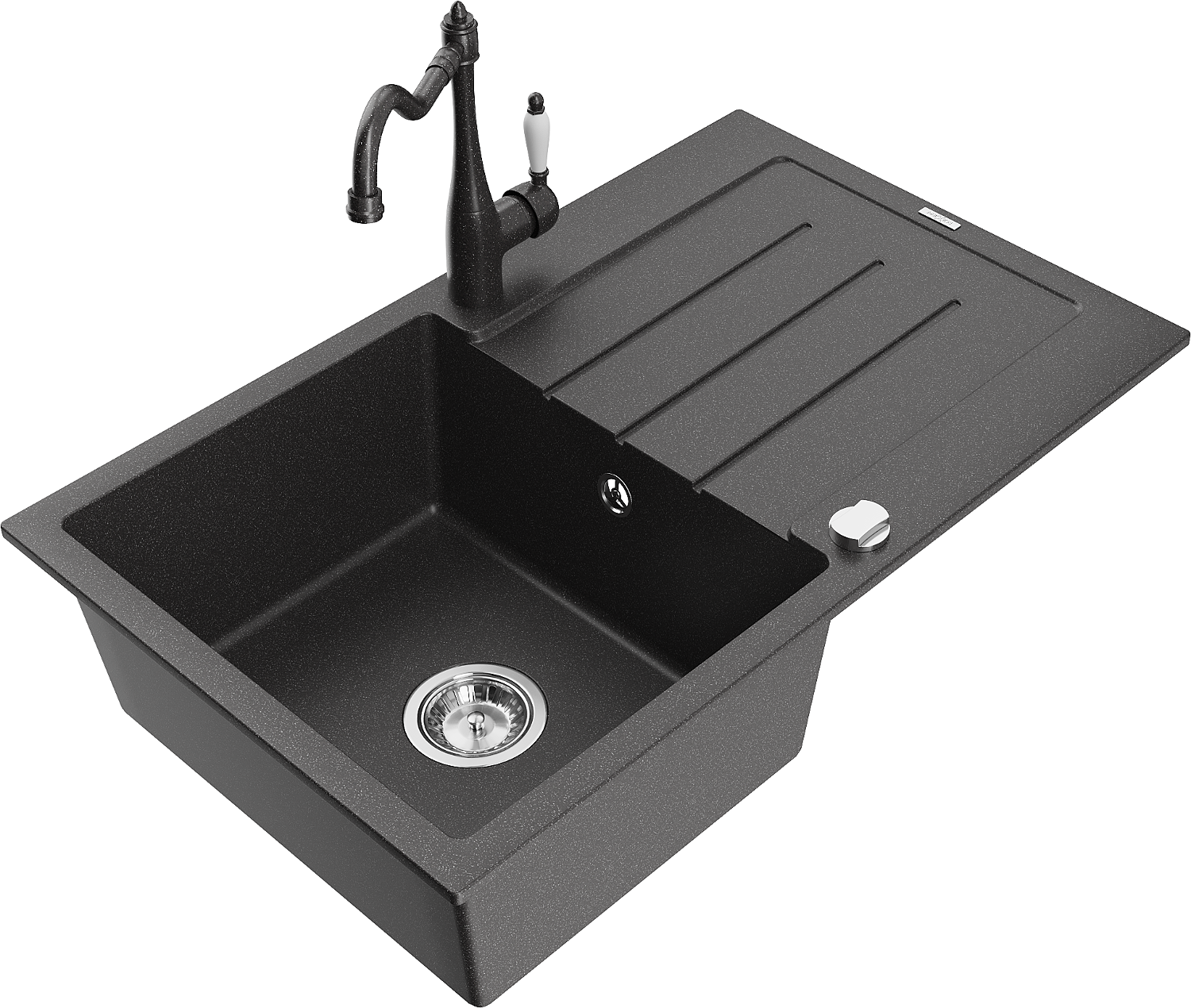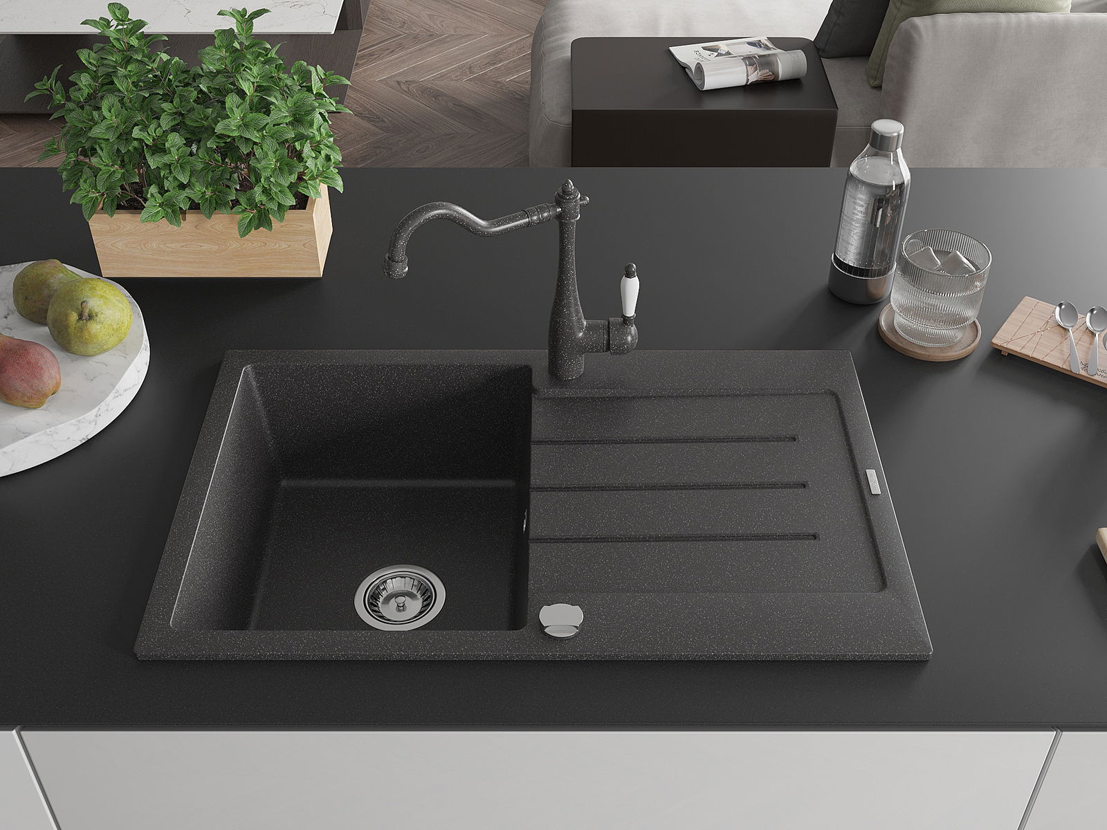 Mexen Bruno žulový kuchynský drez s 1 komorou a odkapávačom a kuchynskou batériou Carla, čierny škvrnitý - 6513-76-670700-76