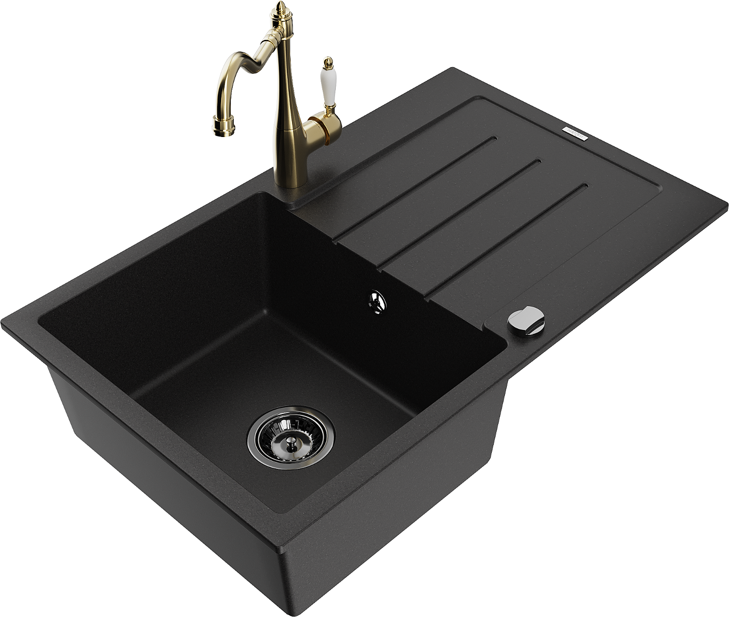 Mexen Bruno 1-komorový žulový drez s odkvapkávačom a kuchynskou batériou Carla, čierny - 6513-77-670700-50-B