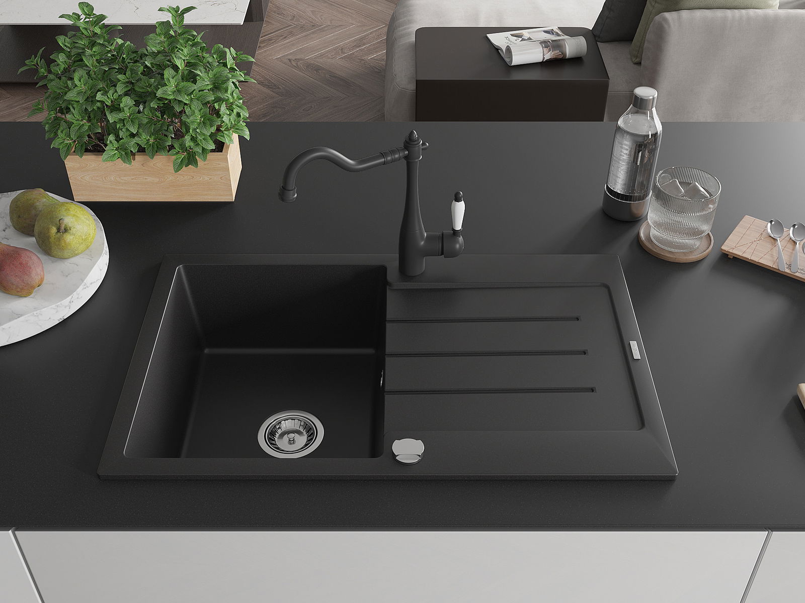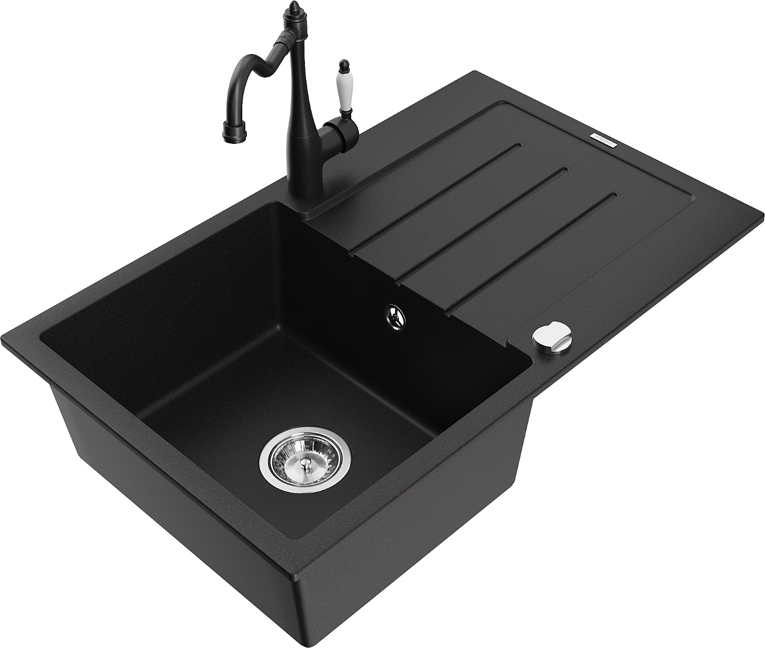 Mexen Bruno žulový drez 1-komorový s odkvapkávačom a kuchynskou batériou Carla, čierny - 6513-77-670700-70