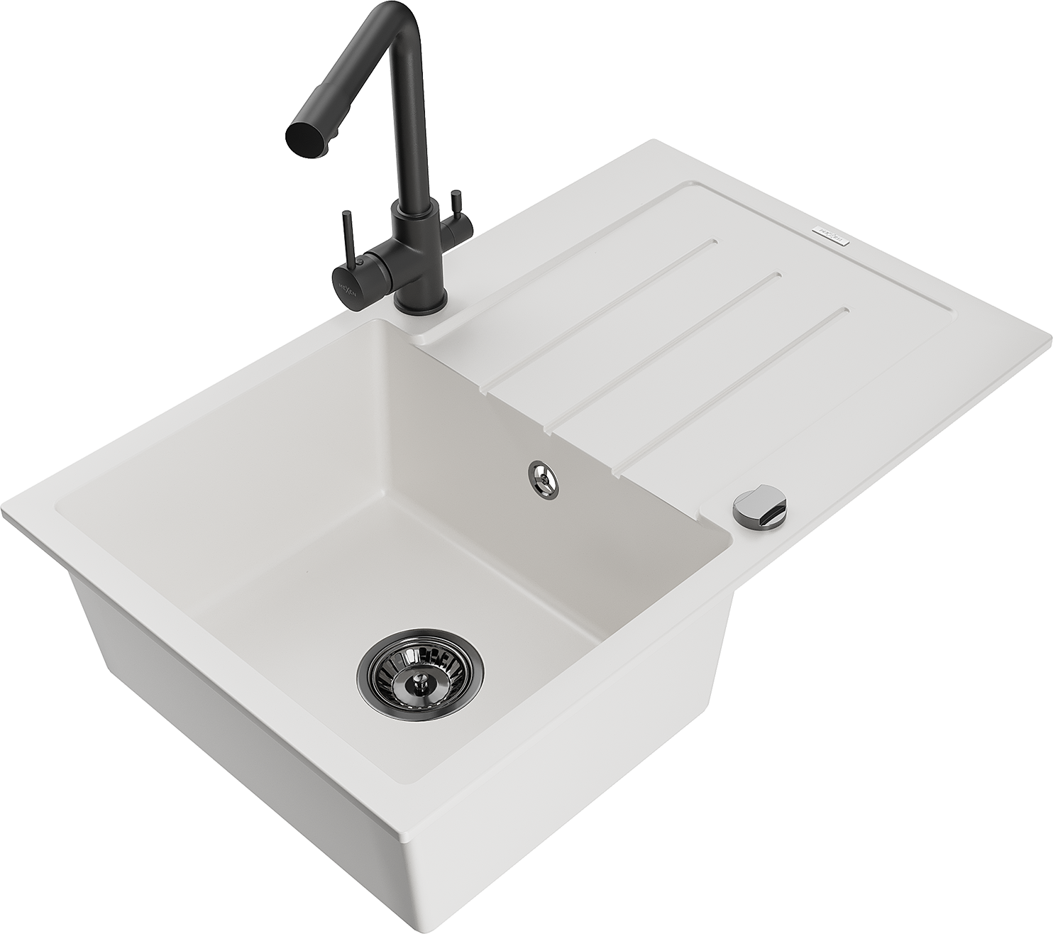 Mexen Bruno granitový drez 1-komorový s odkvapkávačom a kuchynskou batériou Duero, biely - 6513-20-671600-70