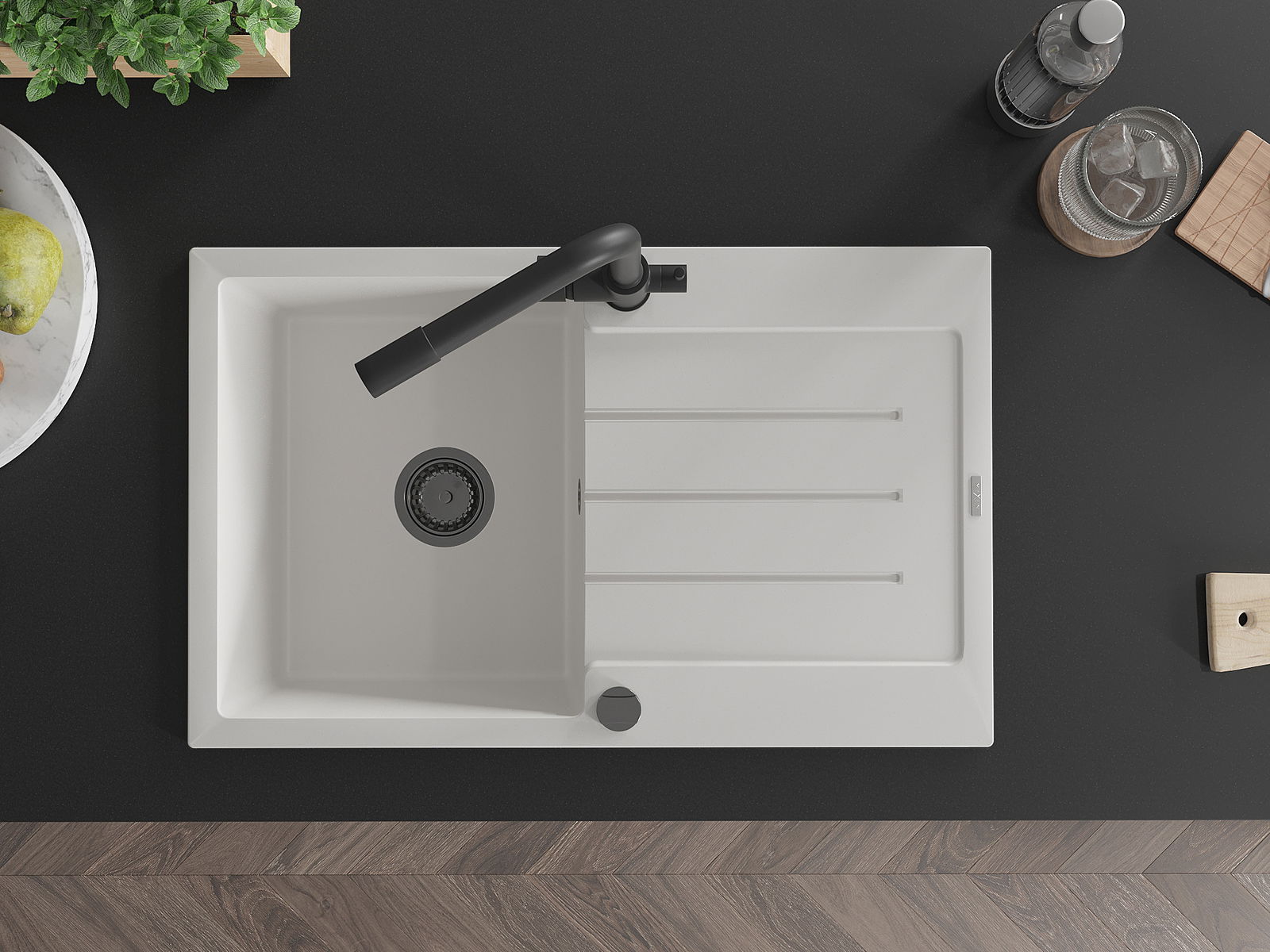 Povrch umývadla je odolný voči škvrnám a sfarbeniu, vďaka čomu sa ľahko čistí a zachováva si svoju farbu po dlhú dobu. Estetický a prakticky dopĺňajúci každú kuchyňu.