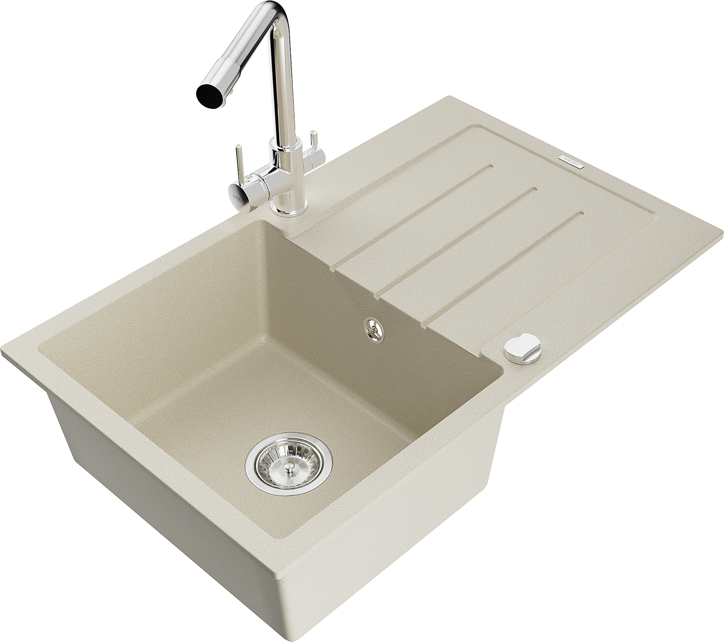 Mexen Bruno granitový drez 1-komorový s odkvapkávačom a kuchynskou batériou Duero, béžový - 6513-69-671600-00