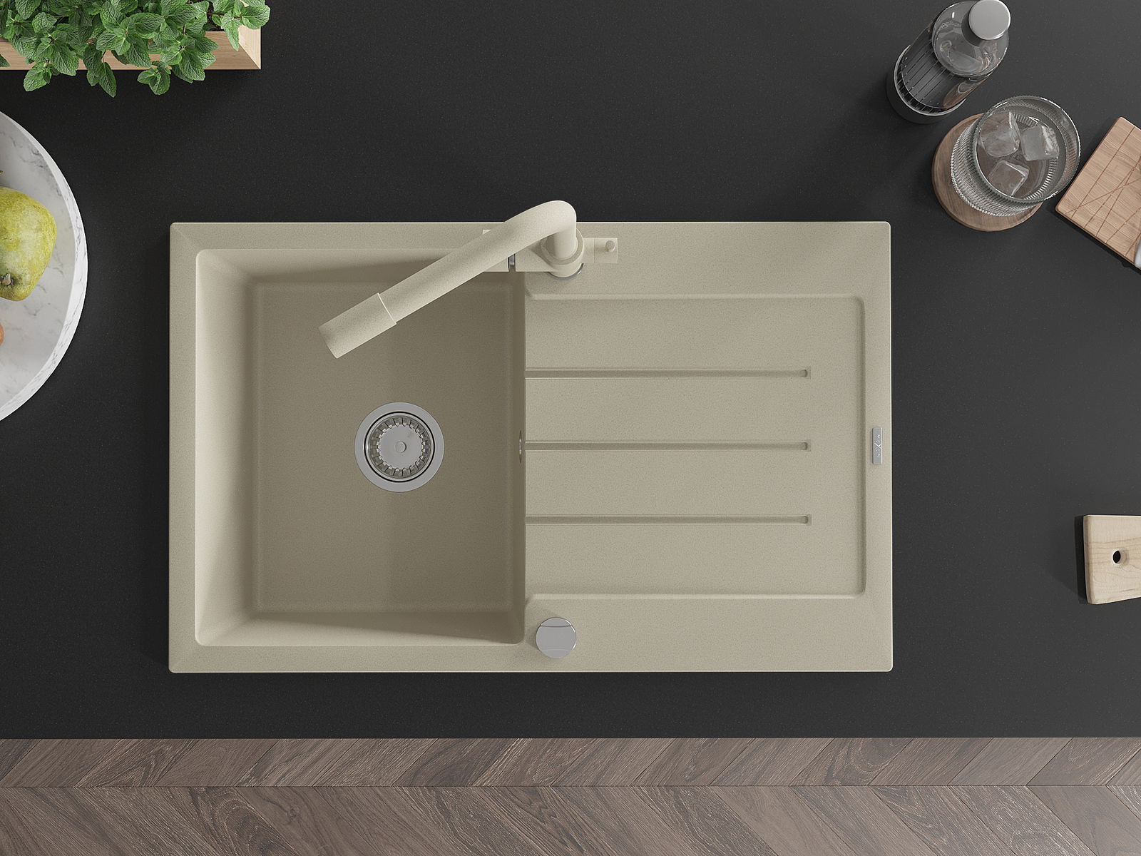 Povrch umývadla je odolný voči škvrnám a sfarbeniu, vďaka čomu sa ľahko čistí a zachováva si svoju farbu po dlhú dobu. Estetický a prakticky dopĺňajúci každú kuchyňu.
